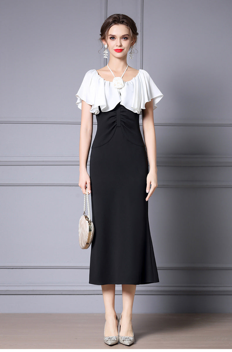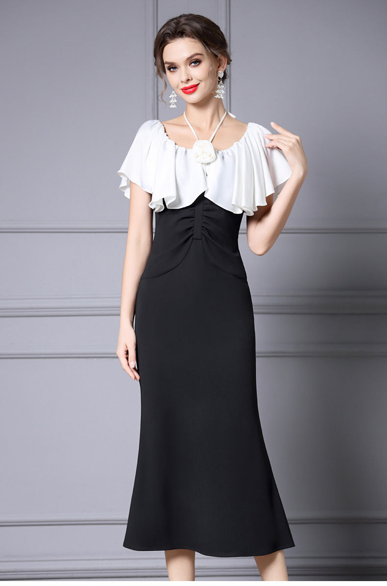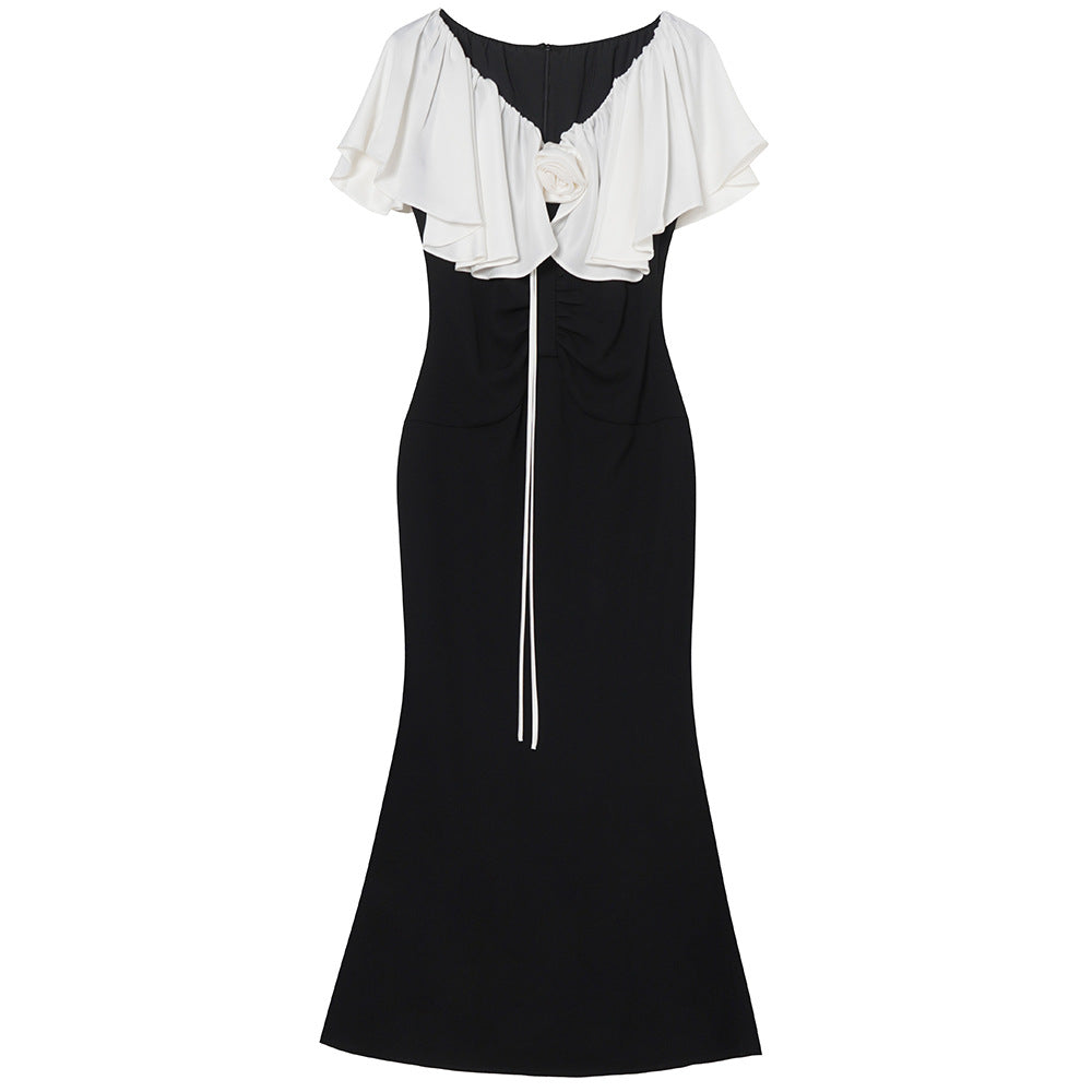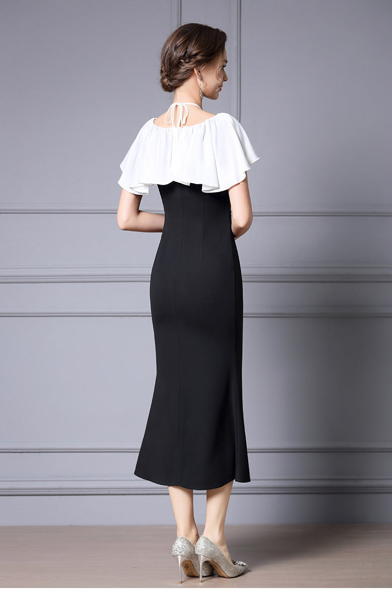 Elegant Black Color-Blocked Fishtail Dress with High Waist