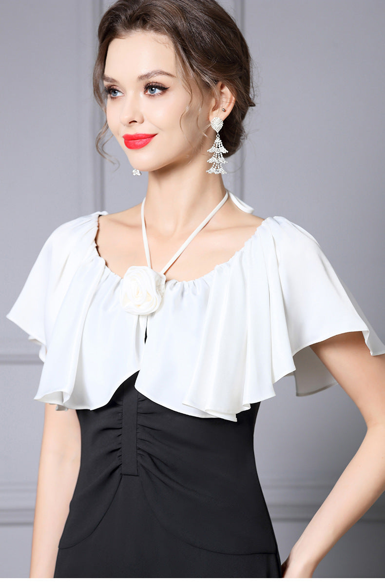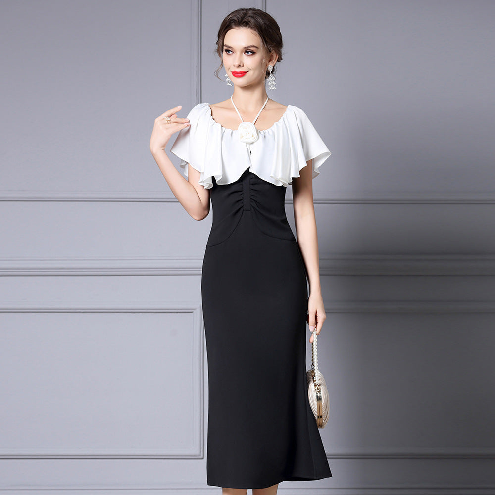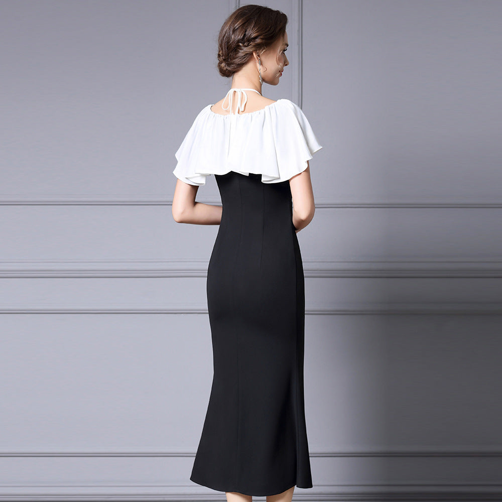Enhance your summer wardrobe with this elegant black color-blocked fishtail dress. Designed with a flattering high waist and a sleek fishtail silhouette, this dress offers a sophisticated yet stylish look. The smooth acetate fabric ensures comfort and breathability, while the round neckline and short sleeves keep the design fresh and versatile. Ideal for formal events, dinner parties, or upscale gatherings, this dress effortlessly combines style and elegance.