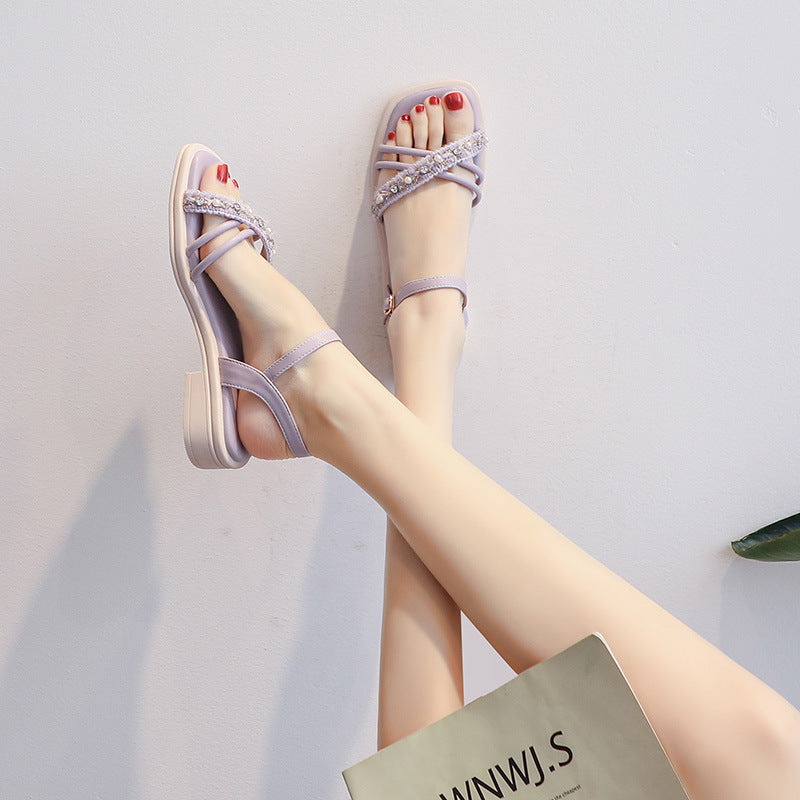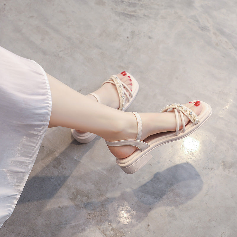 Elegant Summer Flat Roman Sandals for Women with Pearl Straps