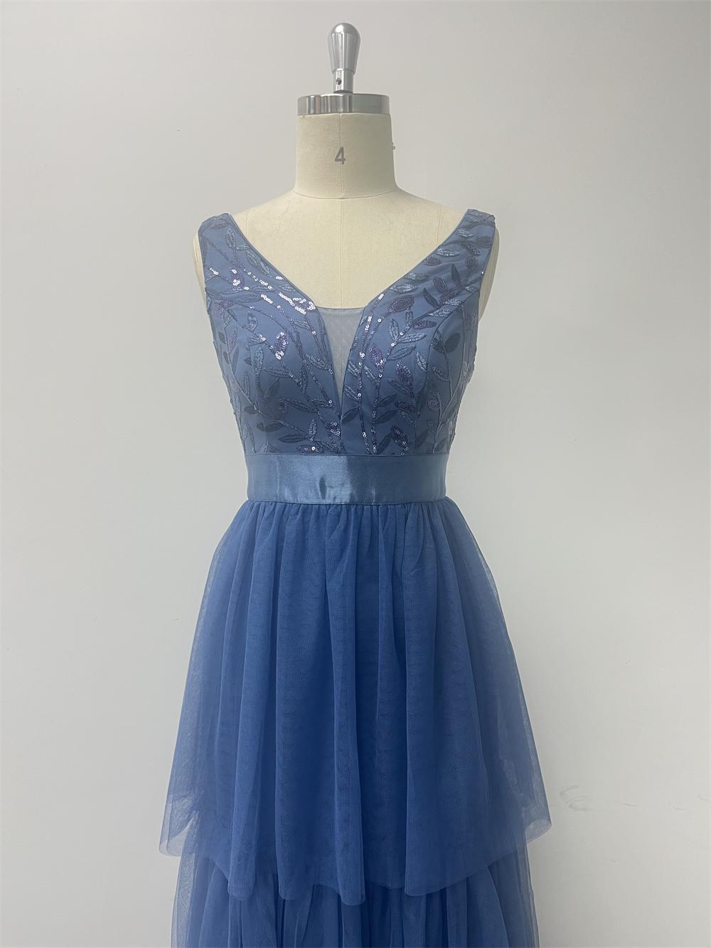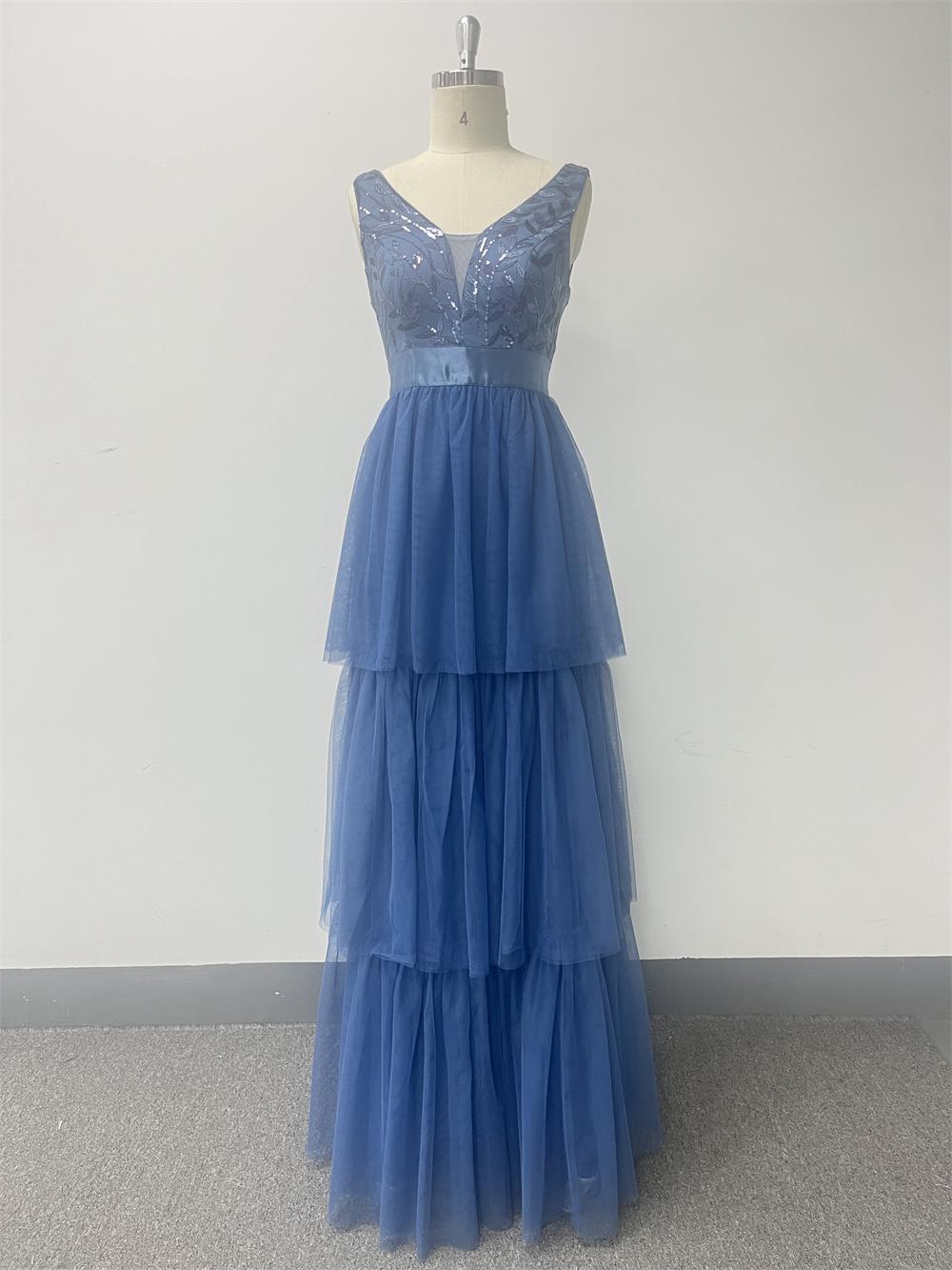 Fall Women Sky Blue Tulle Tiered V-Neck Sleeveless Formal Gown Dresses