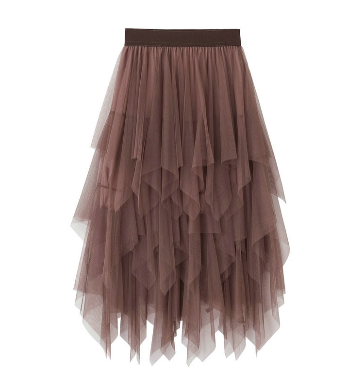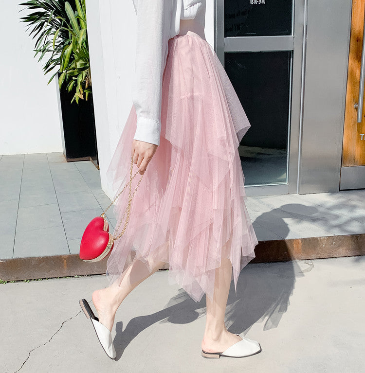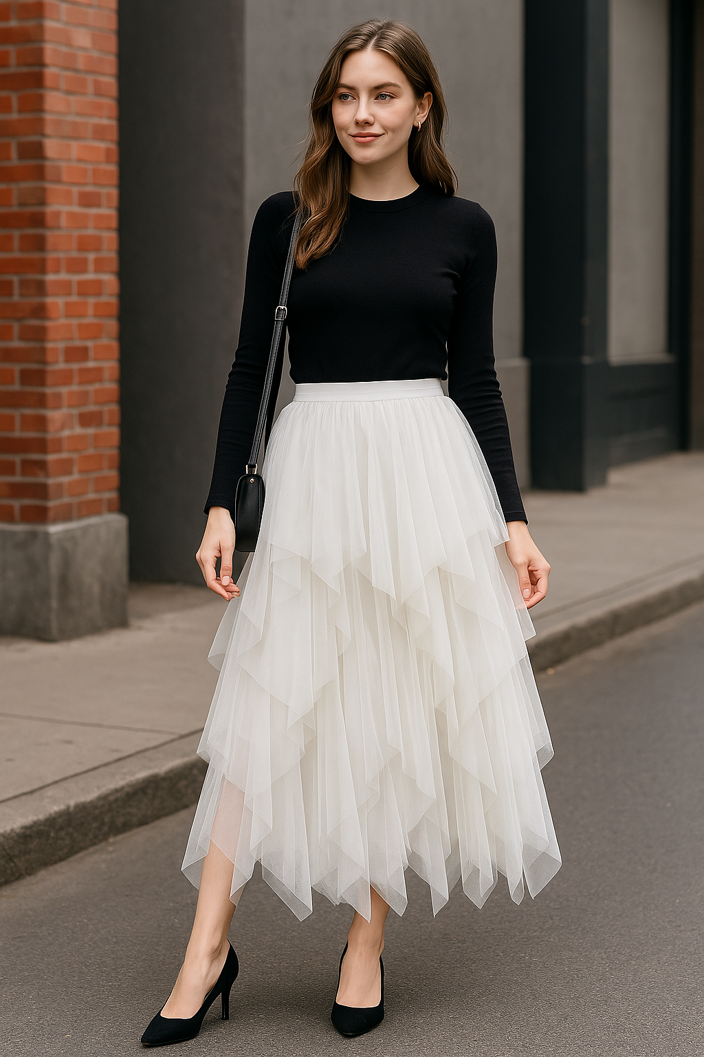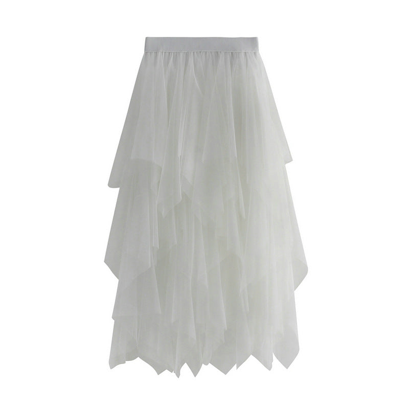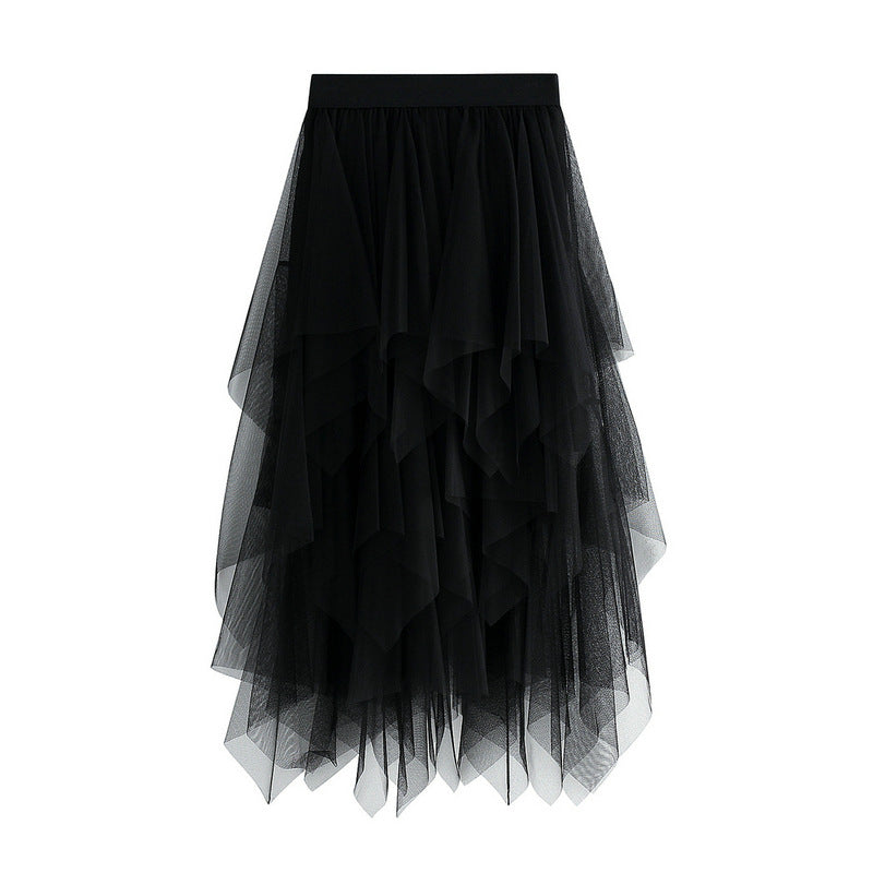 Asymmetrical Layered Mesh Midi Skirt with Tulle Volume