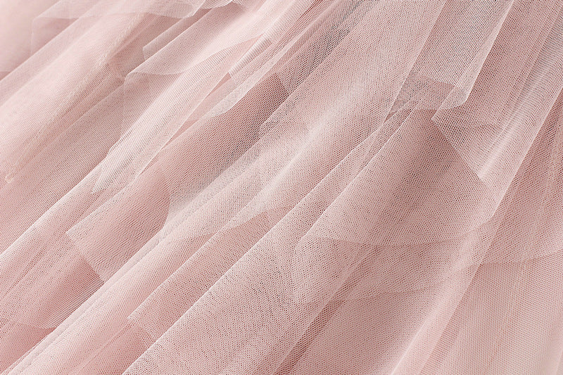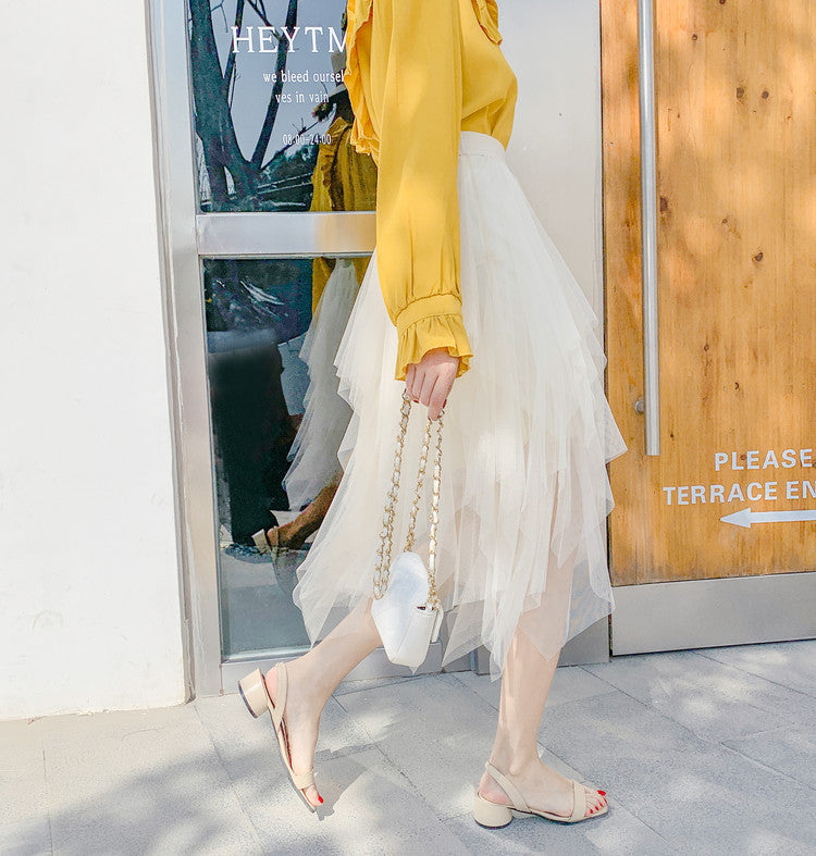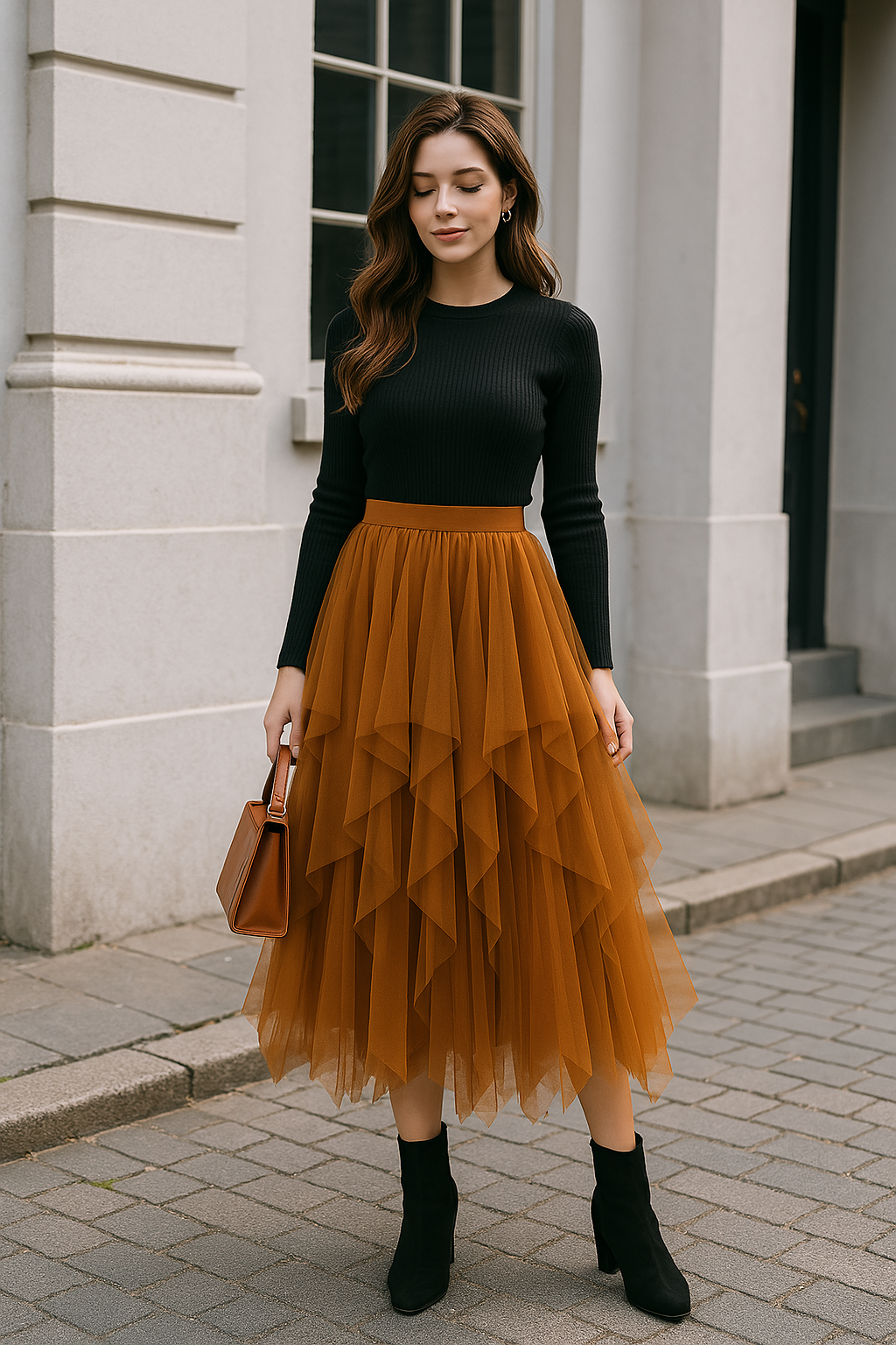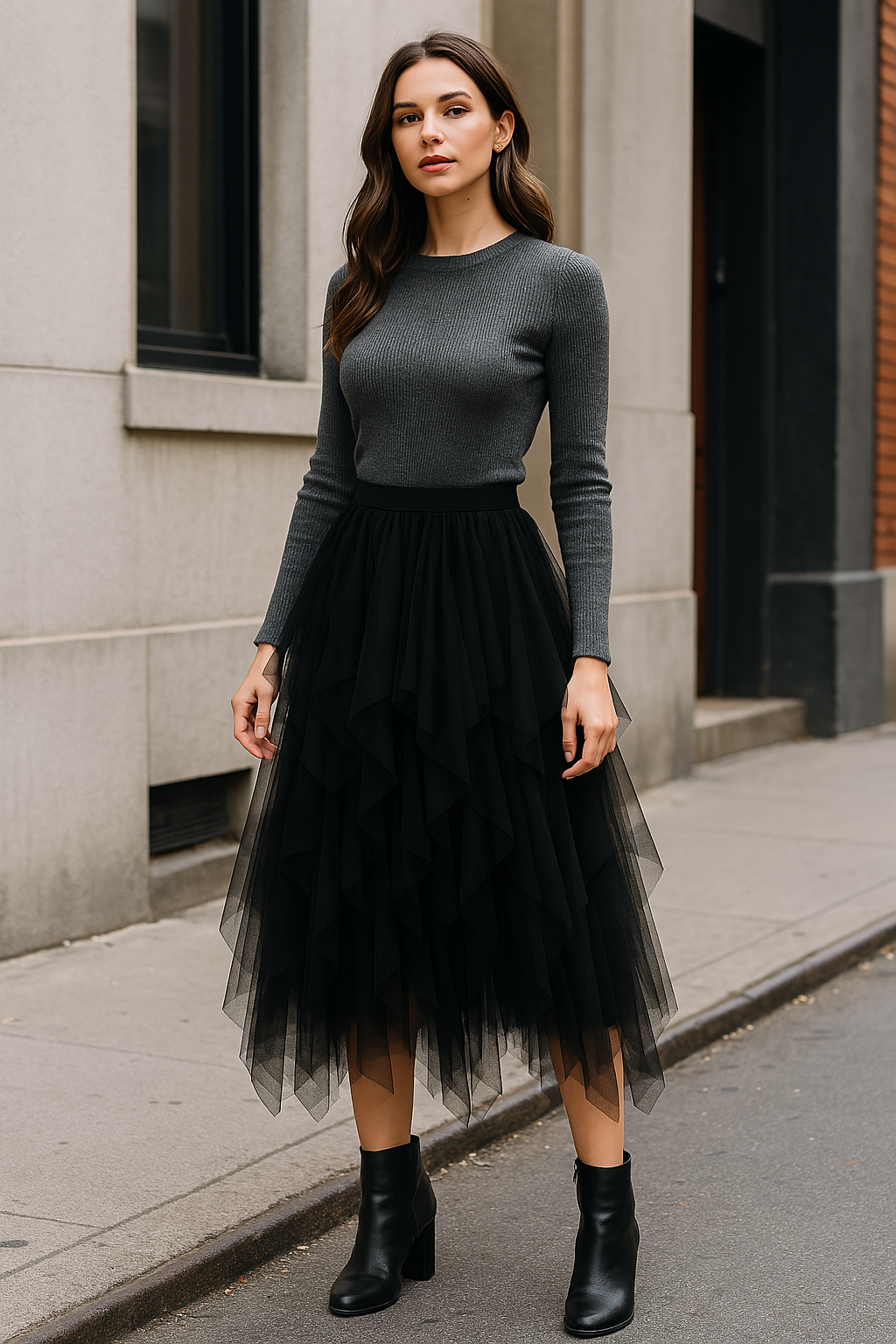 Asymmetrical Layered Mesh Midi Skirt with Tulle Volume