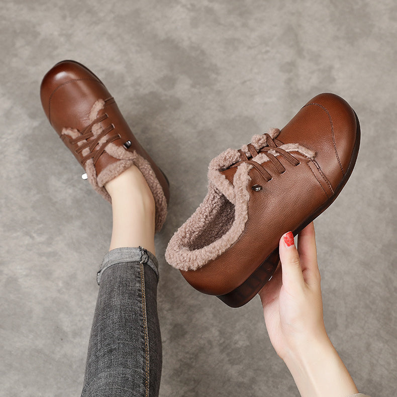 Leather Lace Up Handmade Women's Shoes Round Toe Flat Heel Soft Sole Comfortable Warm Shoes