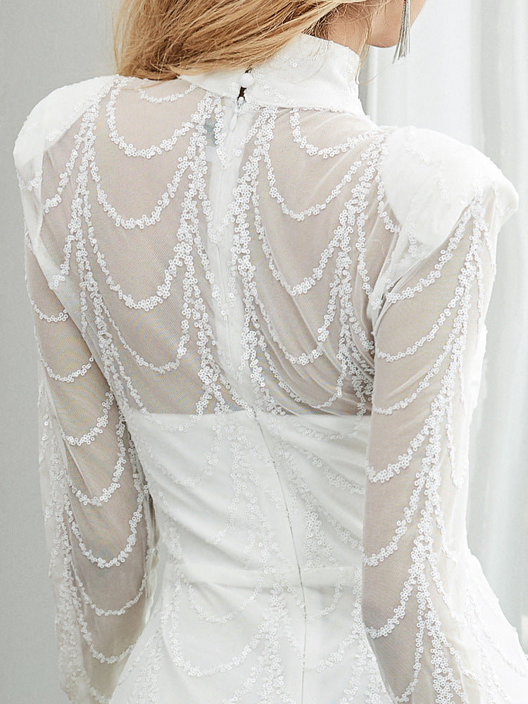 This long sleeve dress is perfect for any formal occasion. It features a trailing design with perspective striped sequins that will make you stand out in any crowd. The fitted bodice and flared skirt will accentuate your figure in all the right ways. You'll love how you look and feel in this dress.