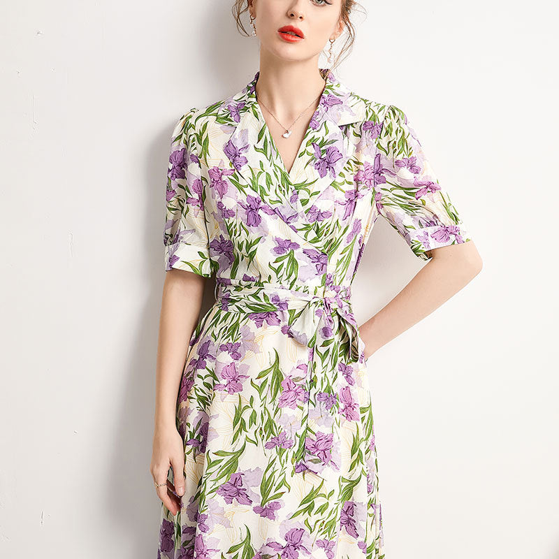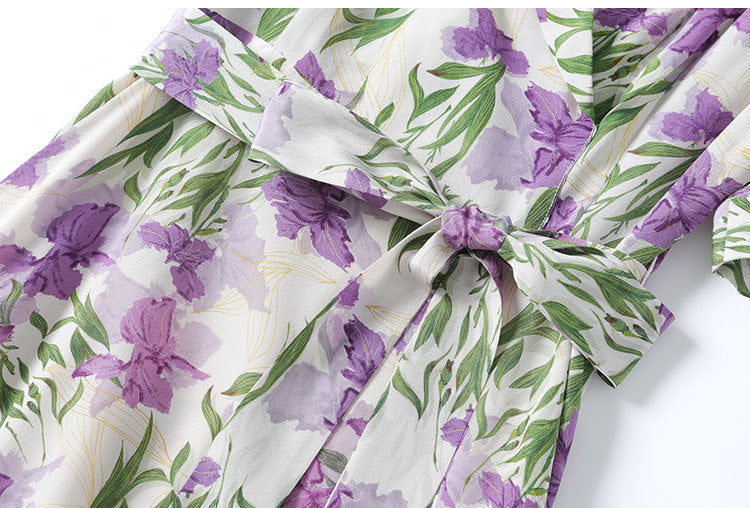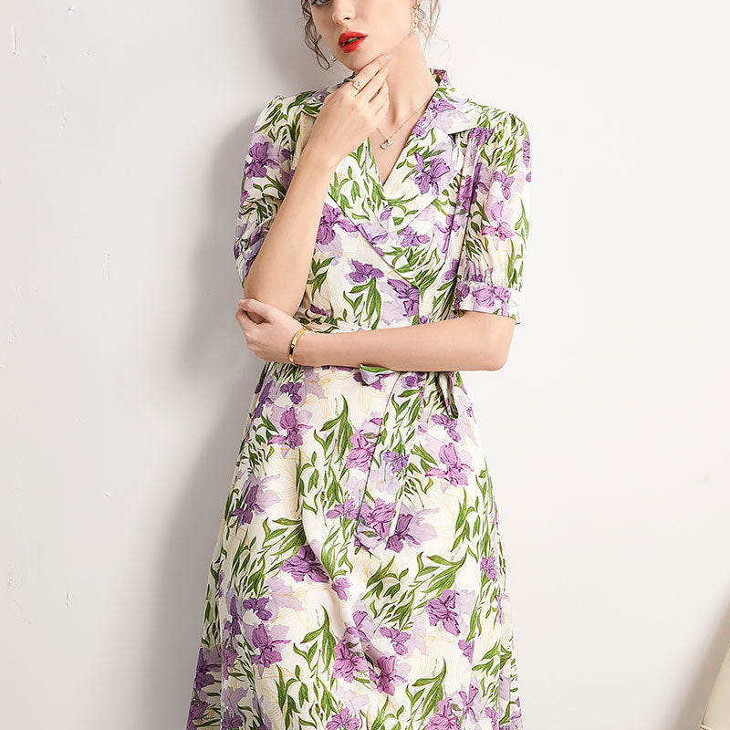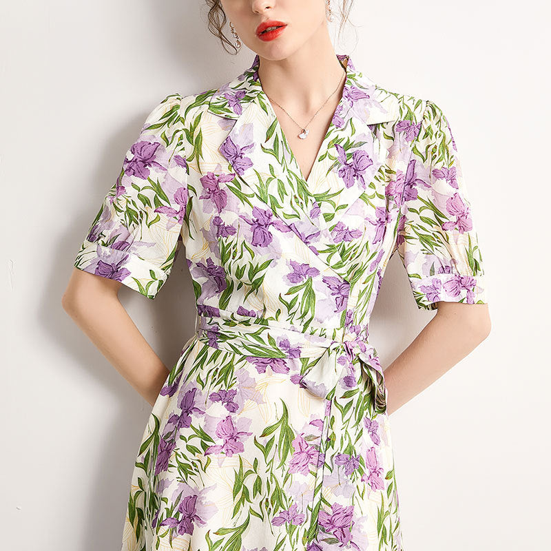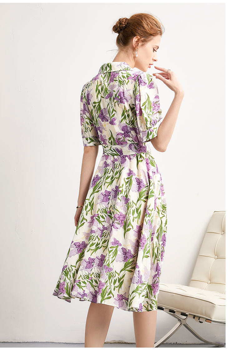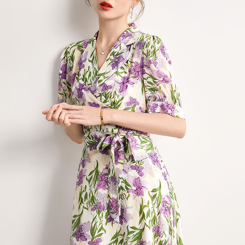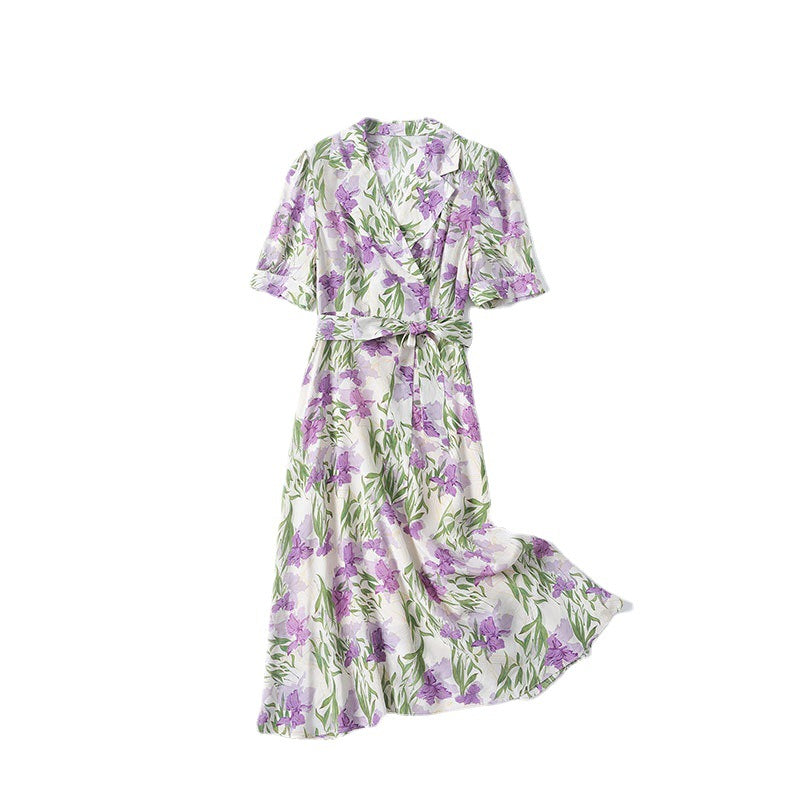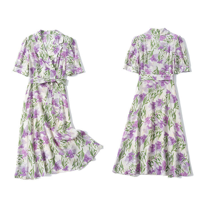 Mulberry Silk Mid-length French Dress Summer Waist Short-sleeved Printed Dress