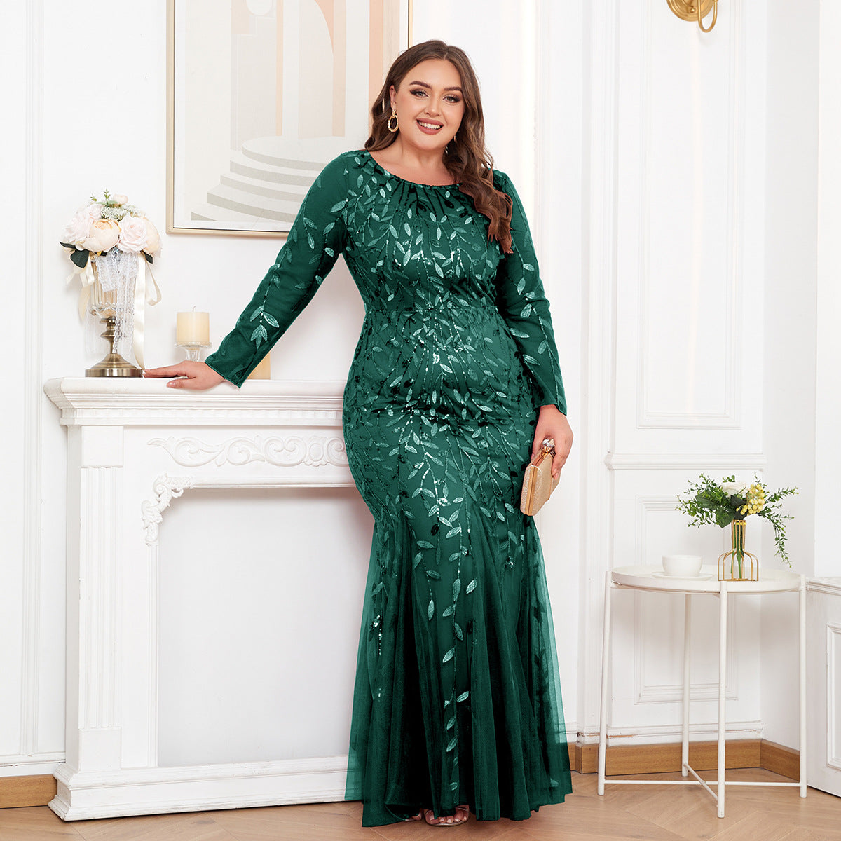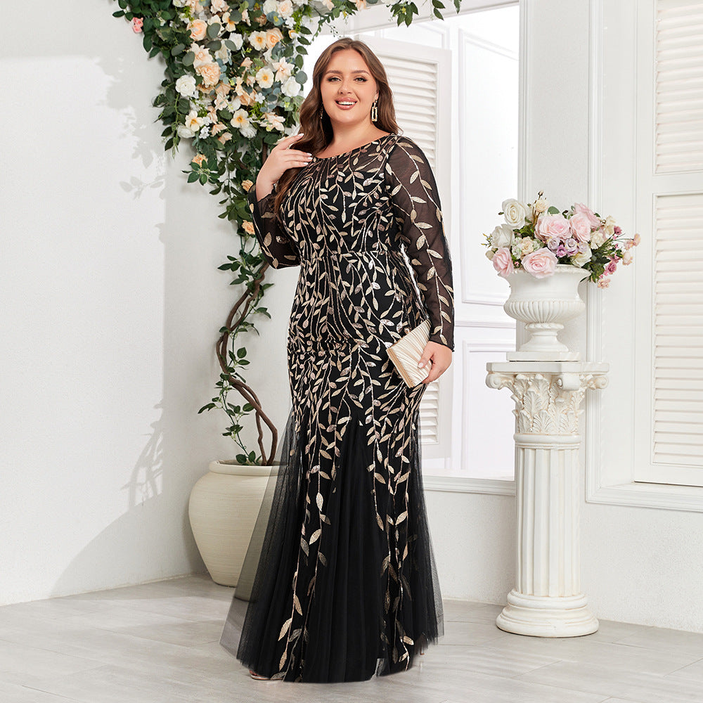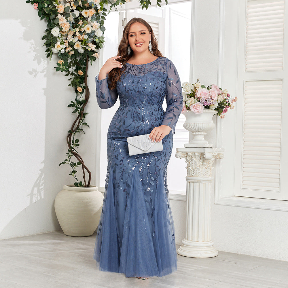 Celebrate your elegance in this breathtaking mermaid - style evening gown, designed for the modern plus - size woman seeking sophistication and comfort. The long sleeves and round neckline exude timeless grace, while the sequined embroidery cascades down the fitted bodice to a dramatic fishtail hemline that flares gracefully with every step. Crafted from high - quality polyester tulle with full lining, this dress ensures breathability and durability for all - night wear.