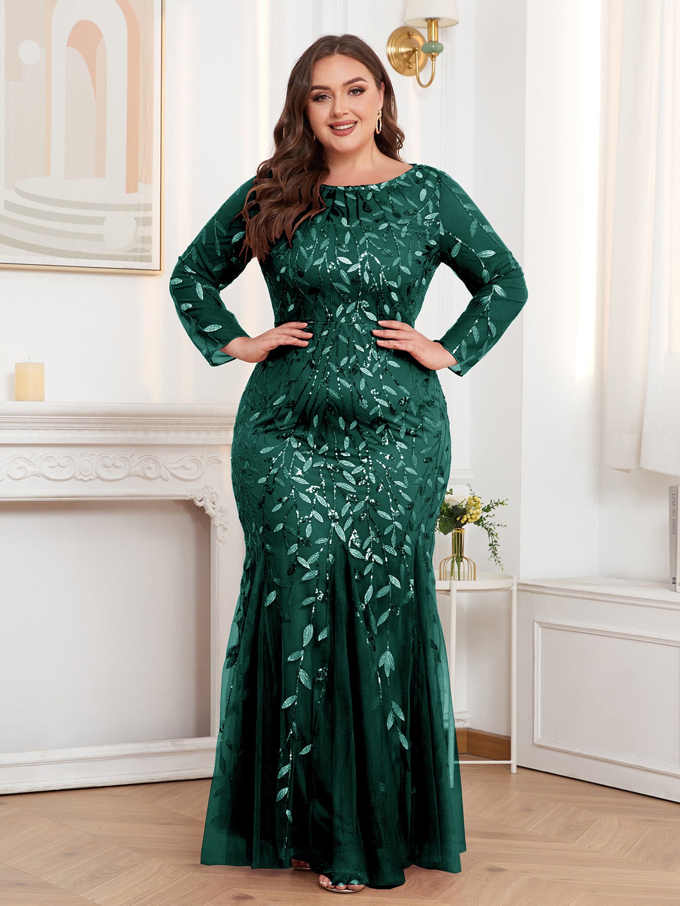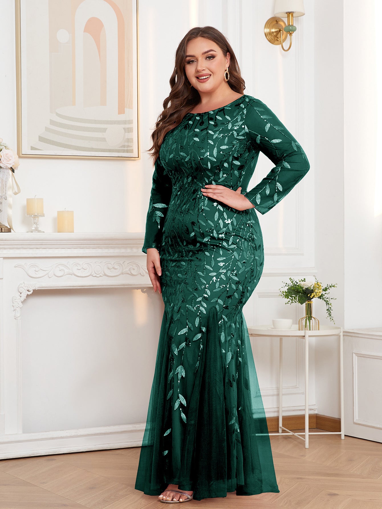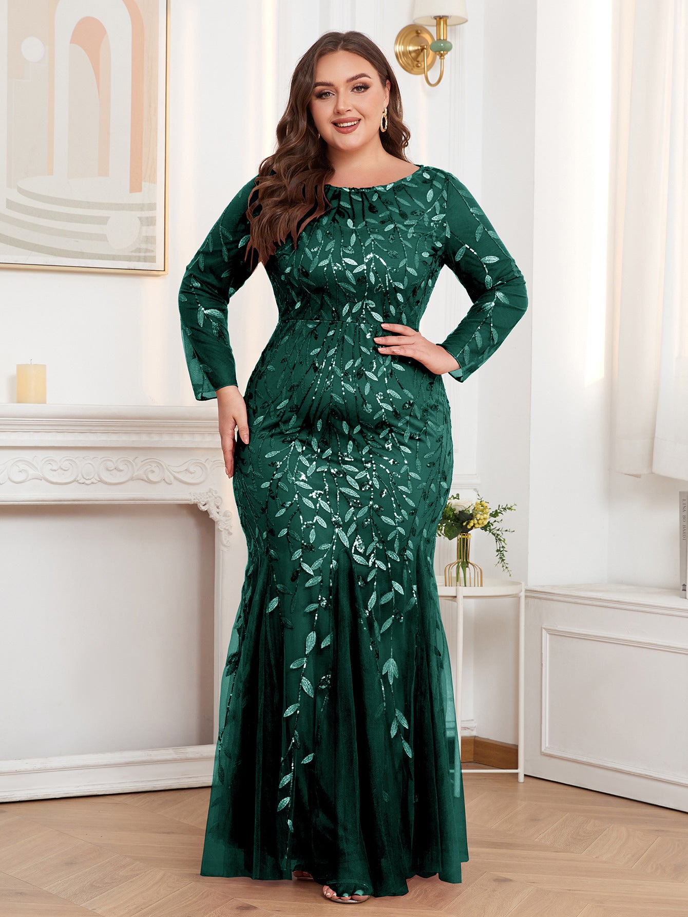 Celebrate your elegance in this breathtaking mermaid - style evening gown, designed for the modern plus - size woman seeking sophistication and comfort. The long sleeves and round neckline exude timeless grace, while the sequined embroidery cascades down the fitted bodice to a dramatic fishtail hemline that flares gracefully with every step. Crafted from high - quality polyester tulle with full lining, this dress ensures breathability and durability for all - night wear.
