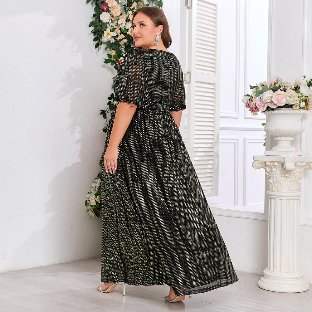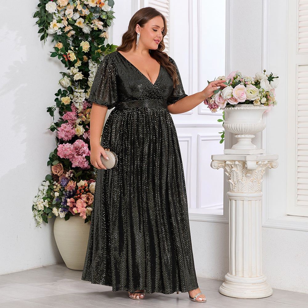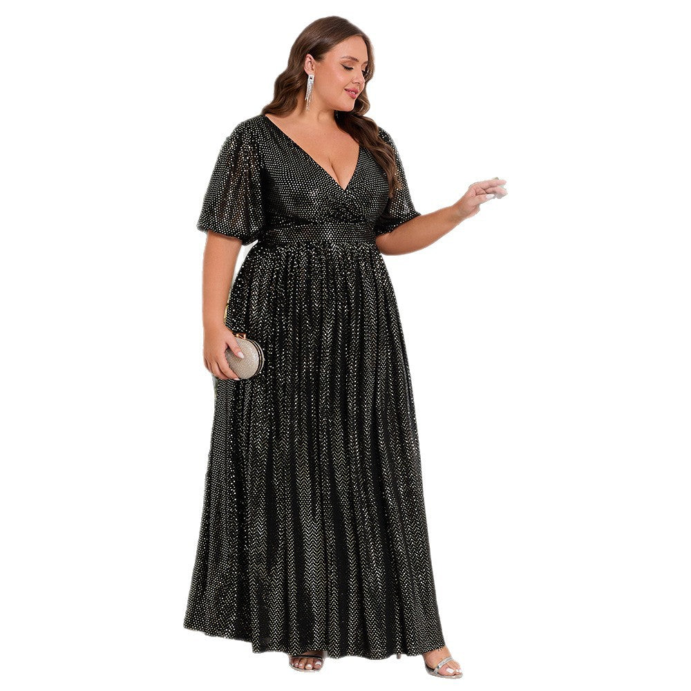 Plus Size Shiny V-Neck Short Sleeve A-Line Evening Dress Brown Formal Party Wear
