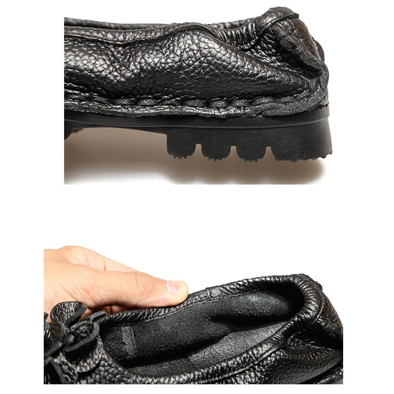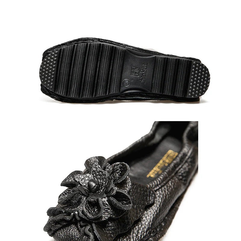 Slip your feet into these loafers the first moment, and feel the buttery soft top grain cowhide skim your skin with zero break-in time. The flexible rubber sole cushions every step as you move, while the handcrafted floral detail catches natural light for a whimsical, lived-in charm. This pair fits perfectly within the Romantic Bohemian style for all your casual outings.