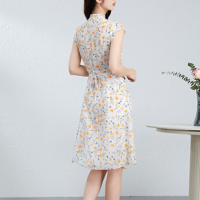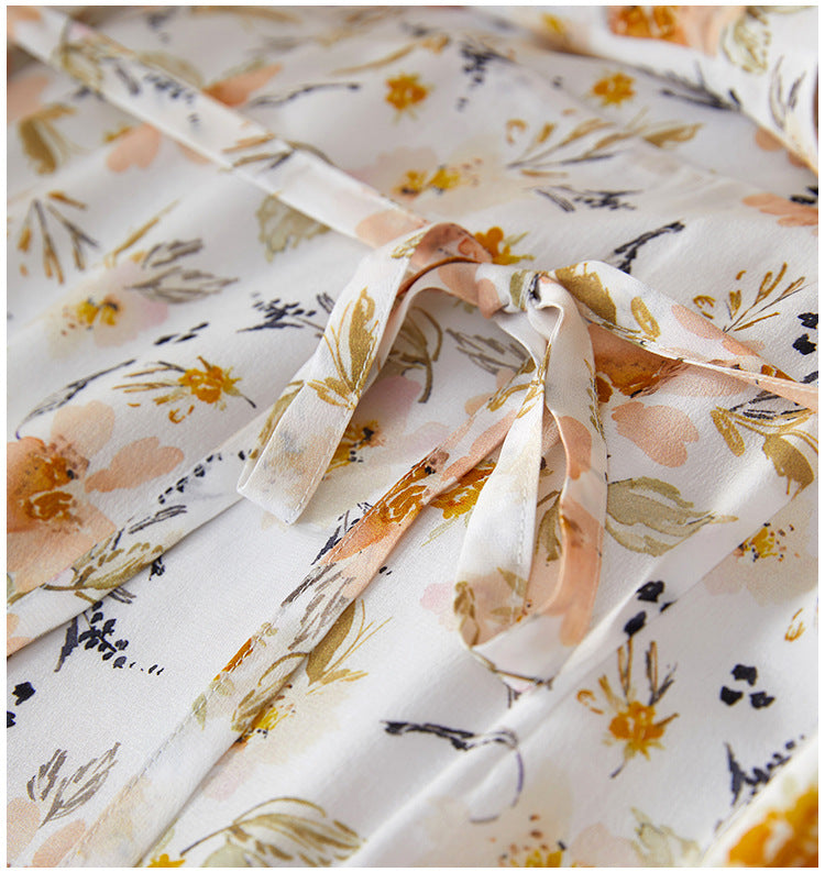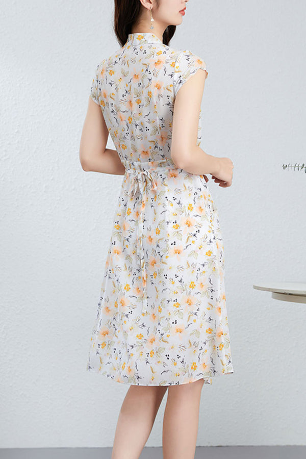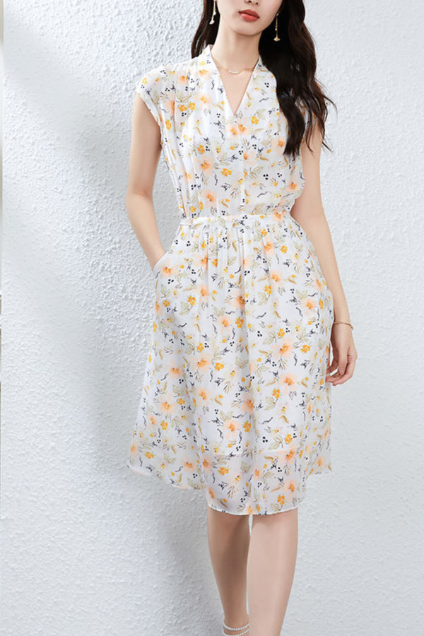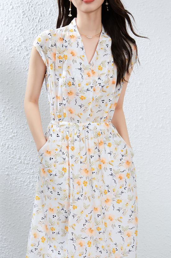 Silk Floral Midi Dress with V-Neck and Tie Waist