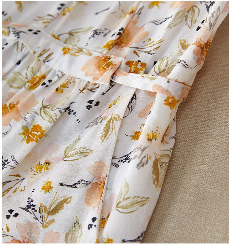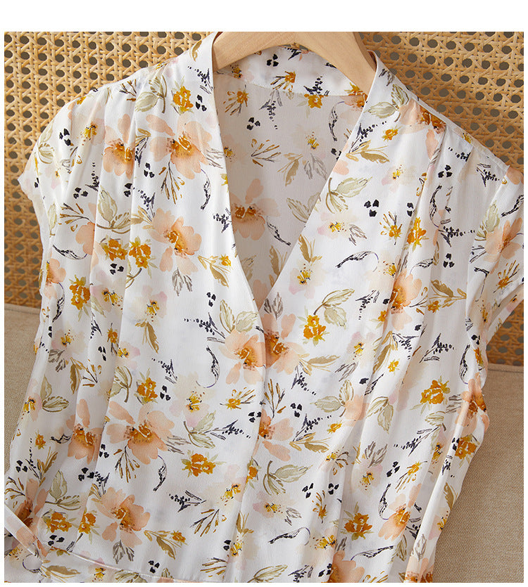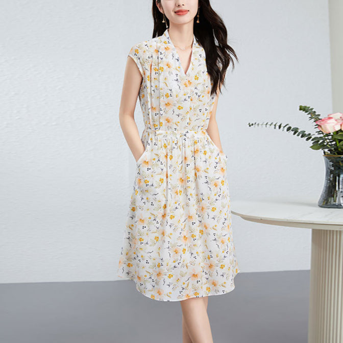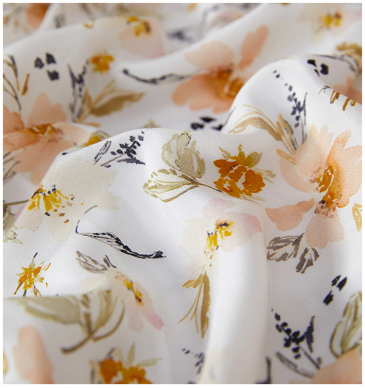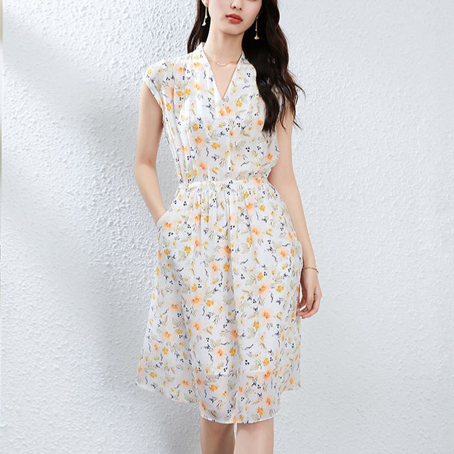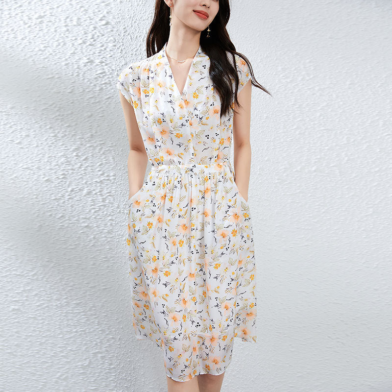 This floral silk midi dress delivers effortless elegance with a French-inspired silhouette made for modern summer wear. Cut from 100% mulberry silk, it features a soft V-neckline, short cap sleeves, and a high-waisted tie belt that defines the figure while offering breathable comfort. The classic A-line cut drapes naturally over petite frames, making it ideal for smaller builds without sacrificing movement. Digital botanical prints in warm neutrals elevate its refined look, perfect for city commutes, brunch dates, or weekend garden walks. A pullover design keeps the look clean and minimal, while the all-natural silk ensures featherlight softness.