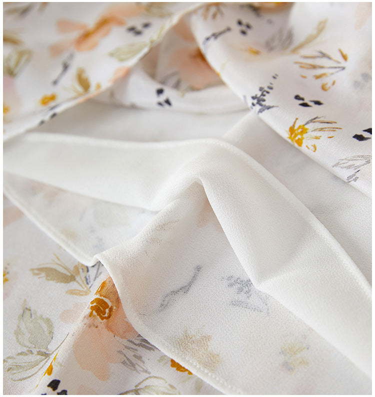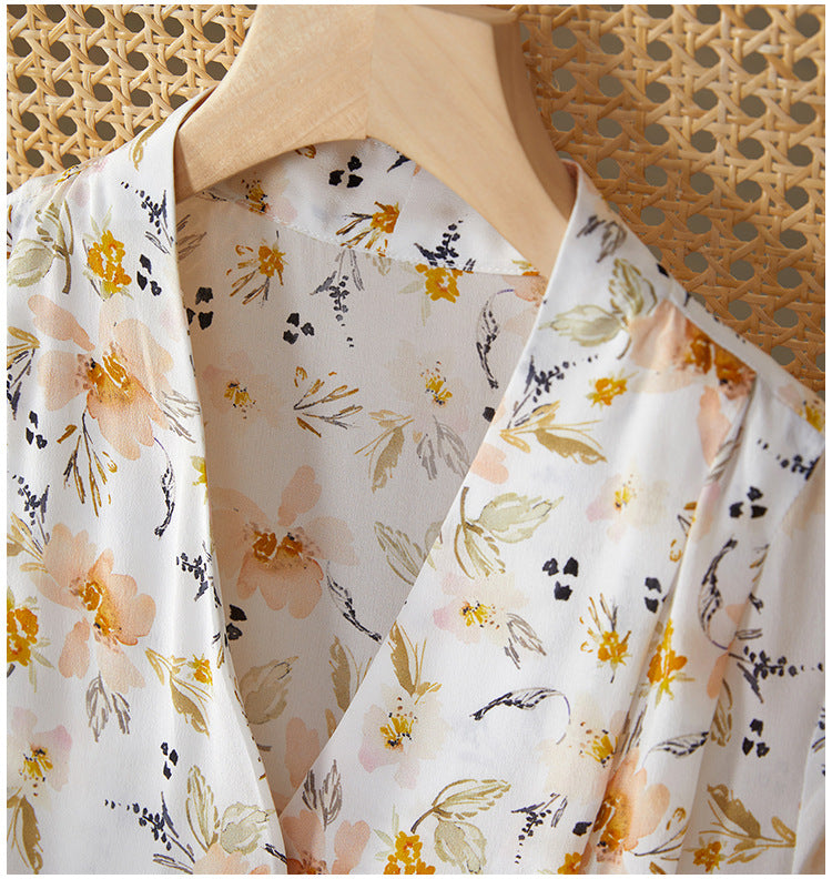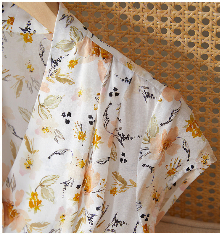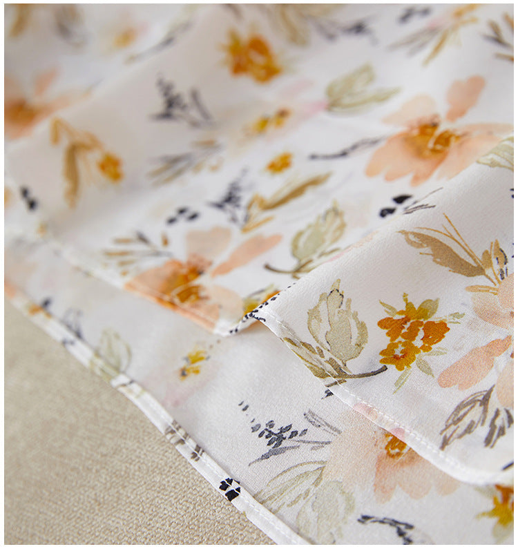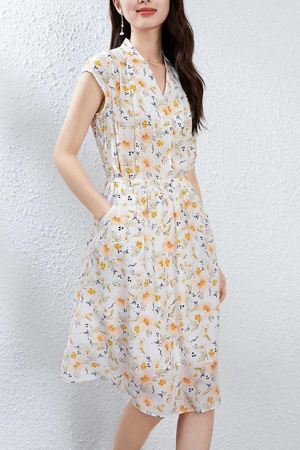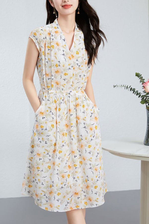 This floral silk midi dress delivers effortless elegance with a French-inspired silhouette made for modern summer wear. Cut from 100% mulberry silk, it features a soft V-neckline, short cap sleeves, and a high-waisted tie belt that defines the figure while offering breathable comfort. The classic A-line cut drapes naturally over petite frames, making it ideal for smaller builds without sacrificing movement. Digital botanical prints in warm neutrals elevate its refined look, perfect for city commutes, brunch dates, or weekend garden walks. A pullover design keeps the look clean and minimal, while the all-natural silk ensures featherlight softness.