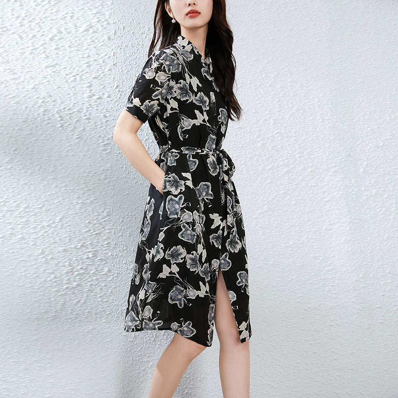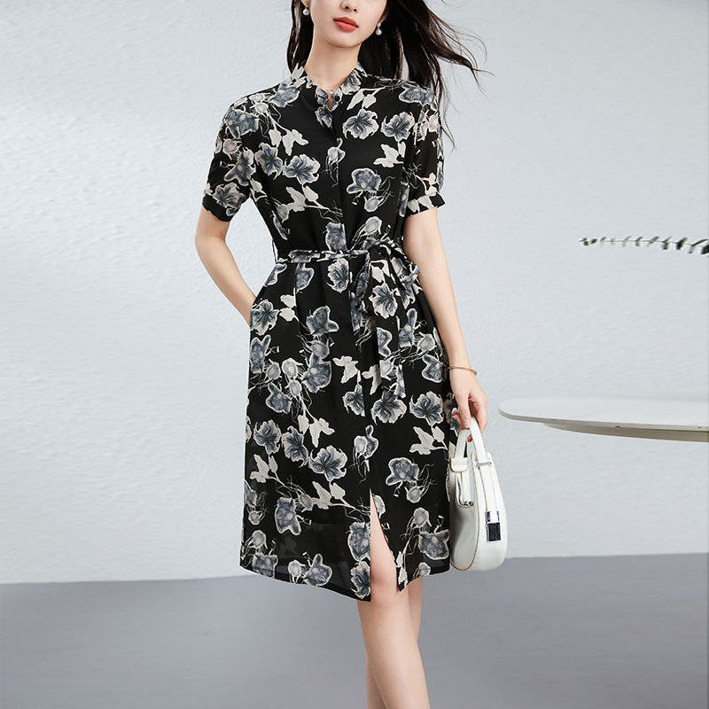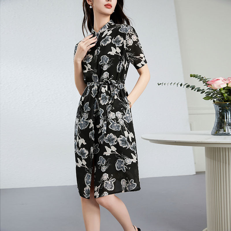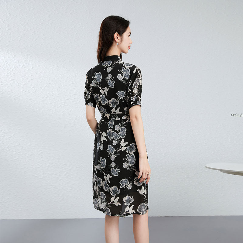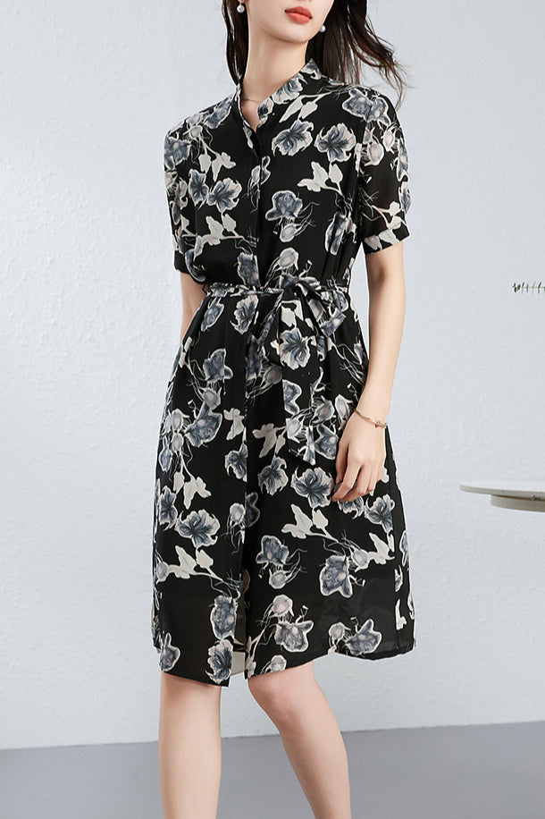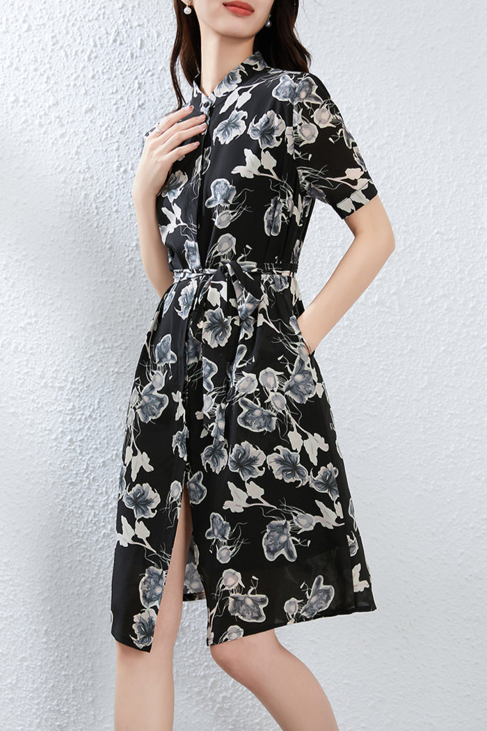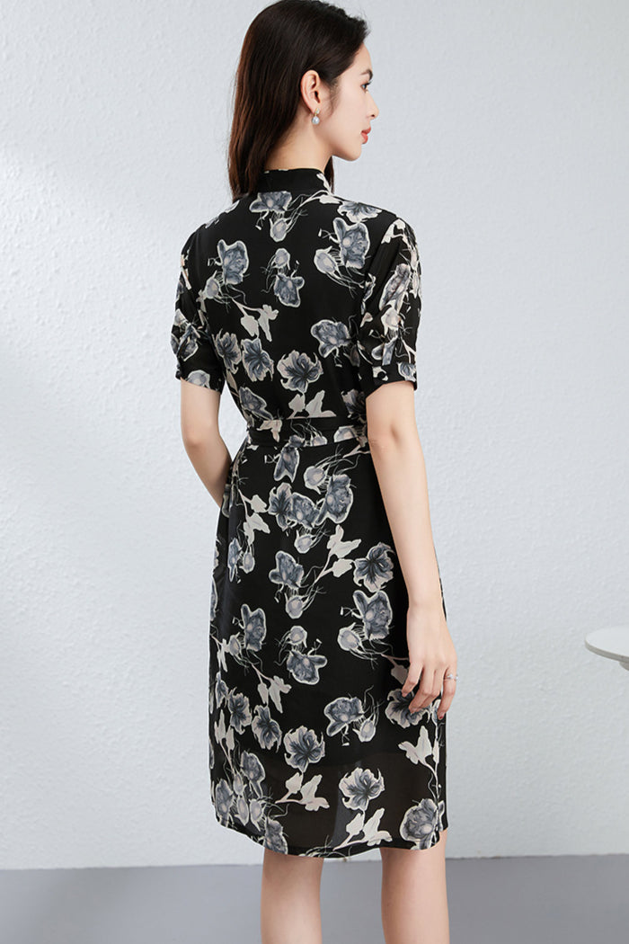 Designed for modern elegance, this black floral silk dress blends tailored lines with soft drape and breathable comfort. Crafted from over 95% mulberry silk, it features a structured Mandarin collar, short sleeves, and an A-line silhouette that flatters while allowing movement. The waist belt enhances the figure without adding bulk, making this piece a go-to for both office hours and evening occasions. A digitally printed floral pattern adds subtle contrast and refined texture to the clean silhouette. Lightweight, breathable, and sleek, this dress brings sophistication with every step.