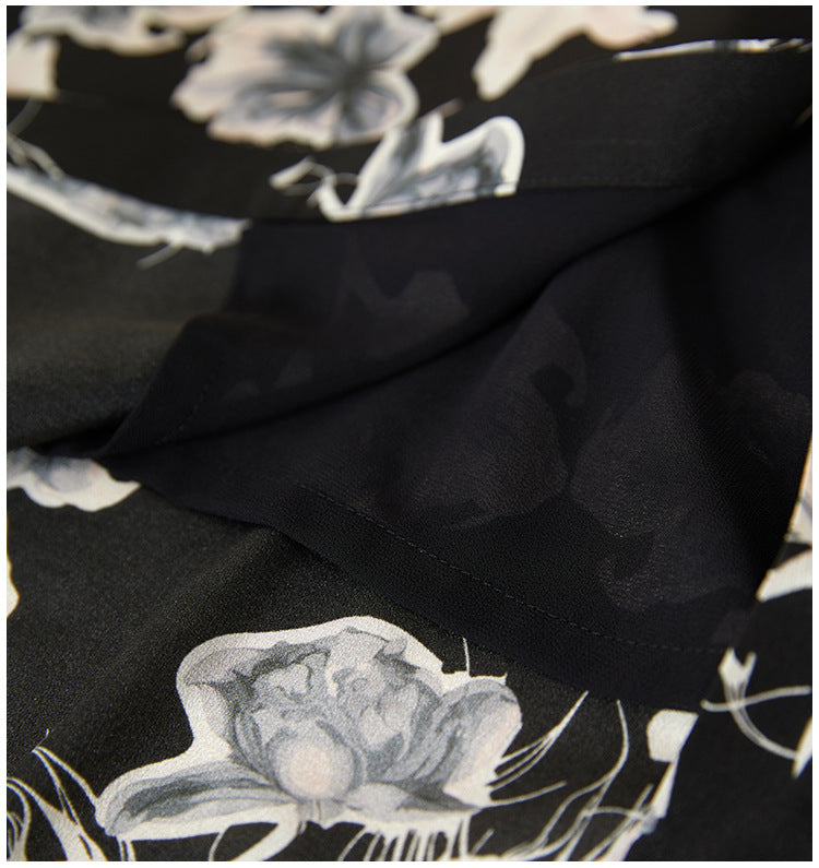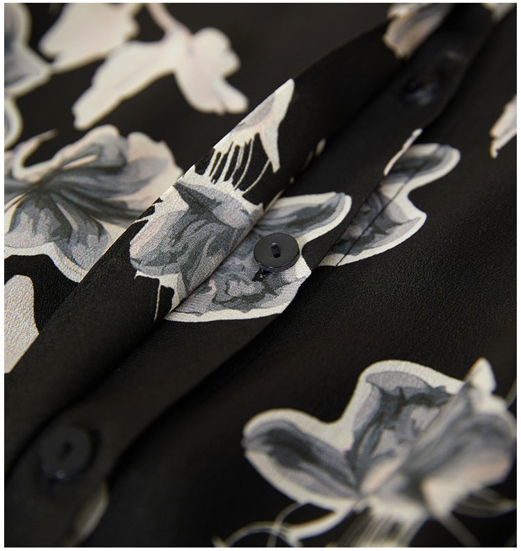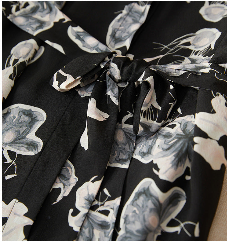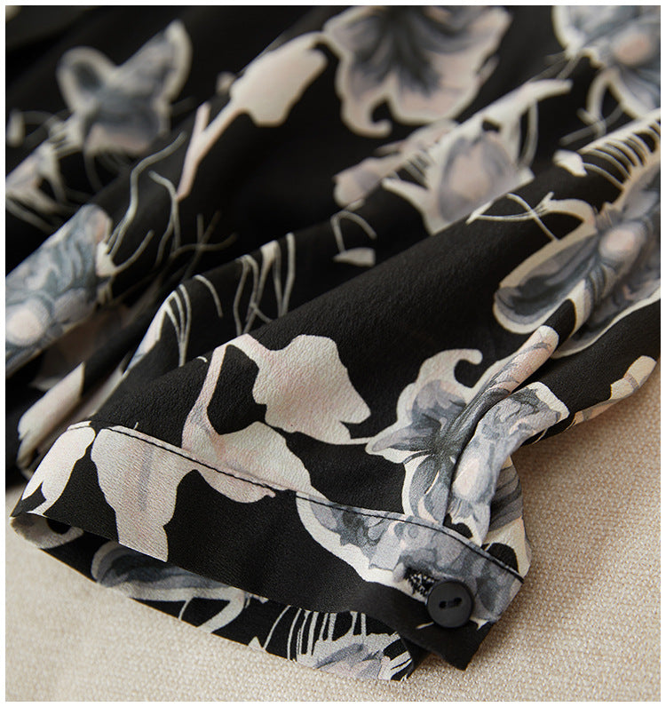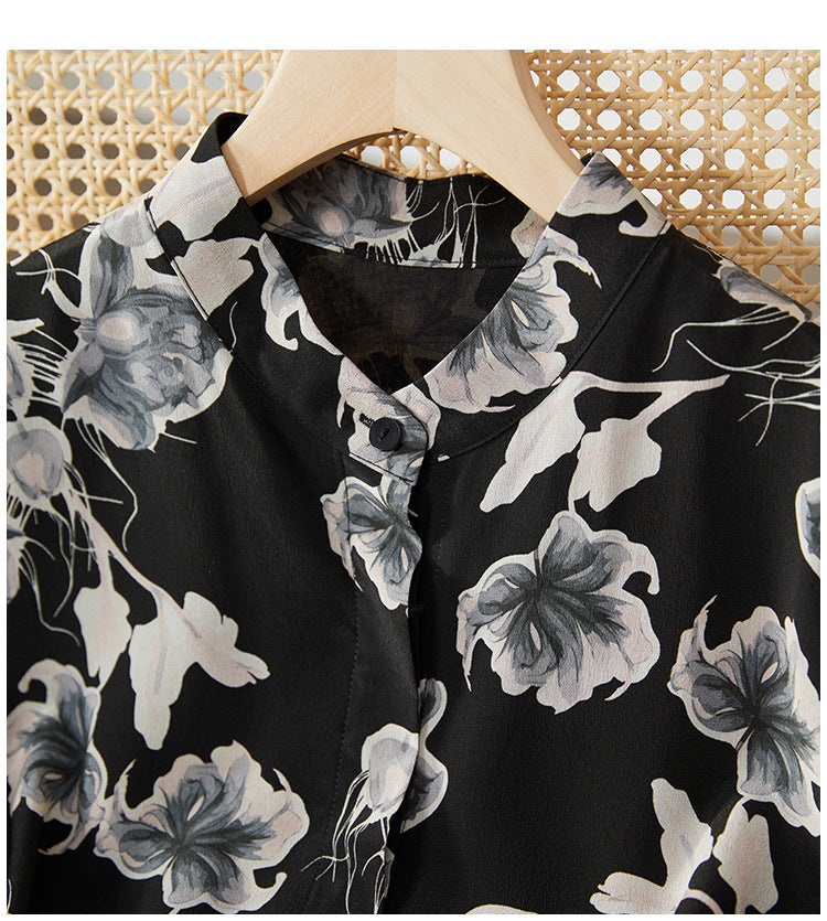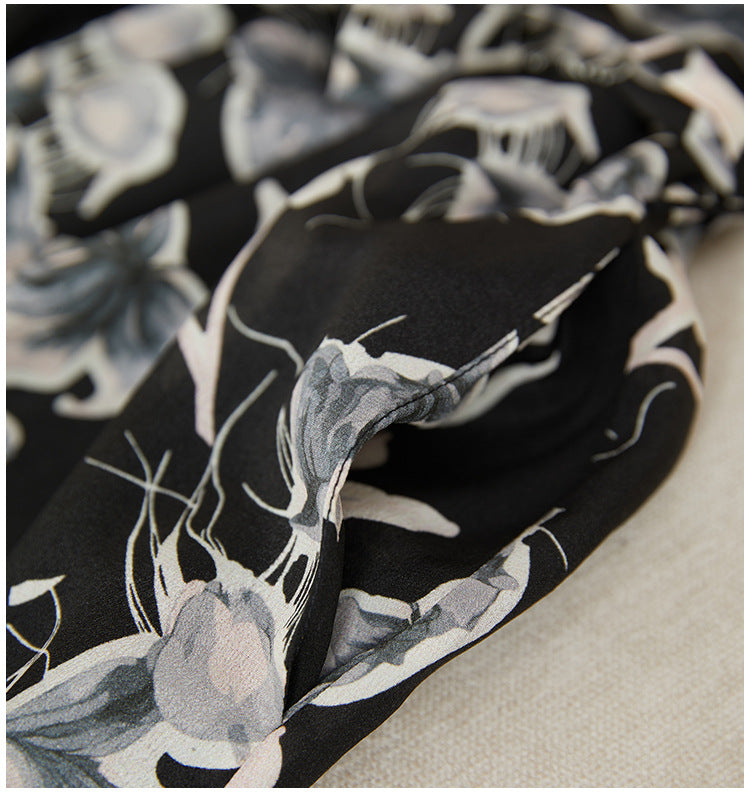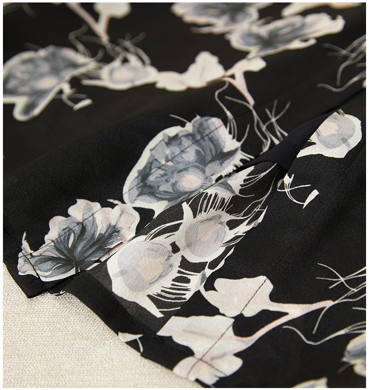 Designed for modern elegance, this black floral silk dress blends tailored lines with soft drape and breathable comfort. Crafted from over 95% mulberry silk, it features a structured Mandarin collar, short sleeves, and an A-line silhouette that flatters while allowing movement. The waist belt enhances the figure without adding bulk, making this piece a go-to for both office hours and evening occasions. A digitally printed floral pattern adds subtle contrast and refined texture to the clean silhouette. Lightweight, breathable, and sleek, this dress brings sophistication with every step.