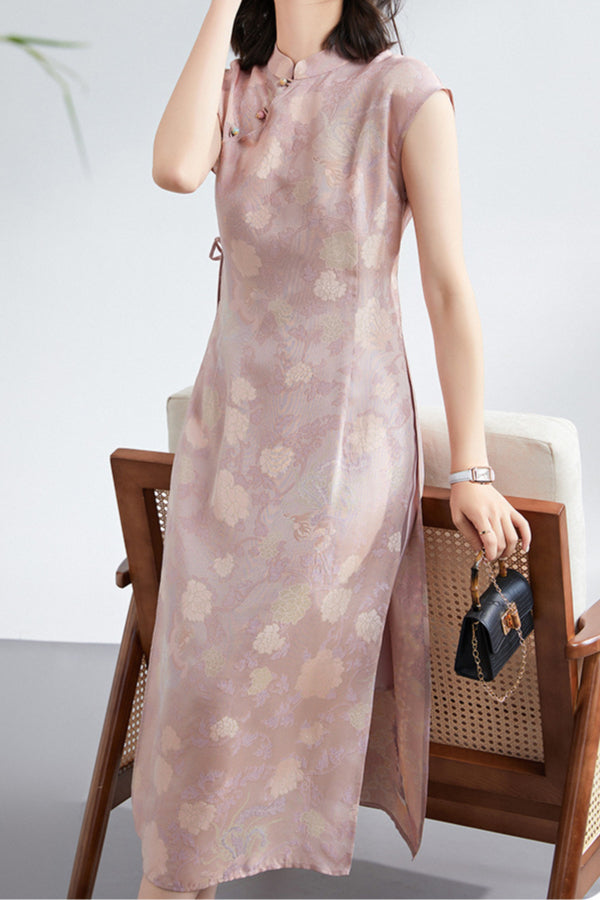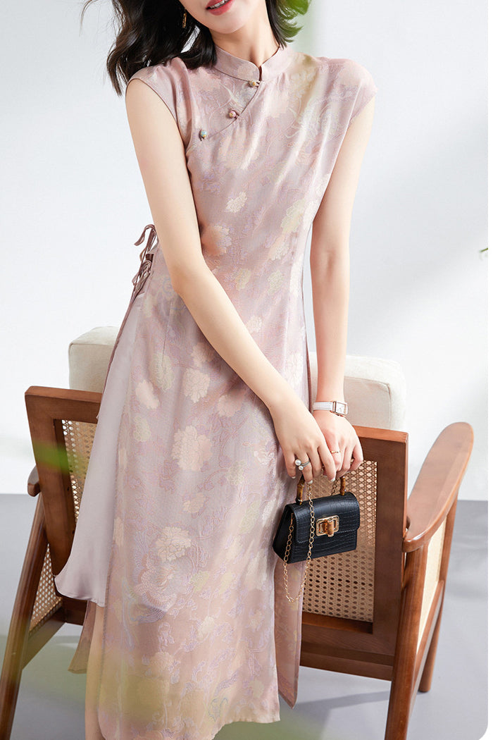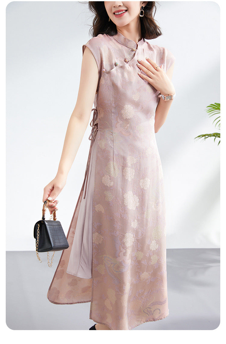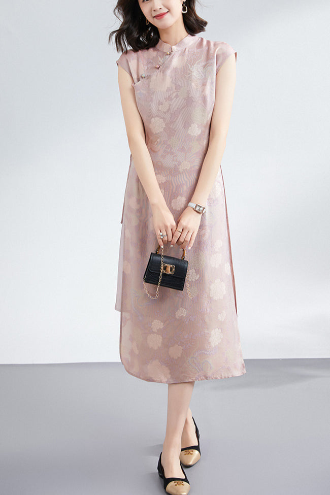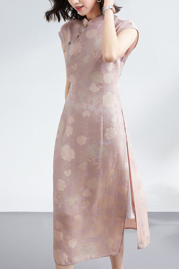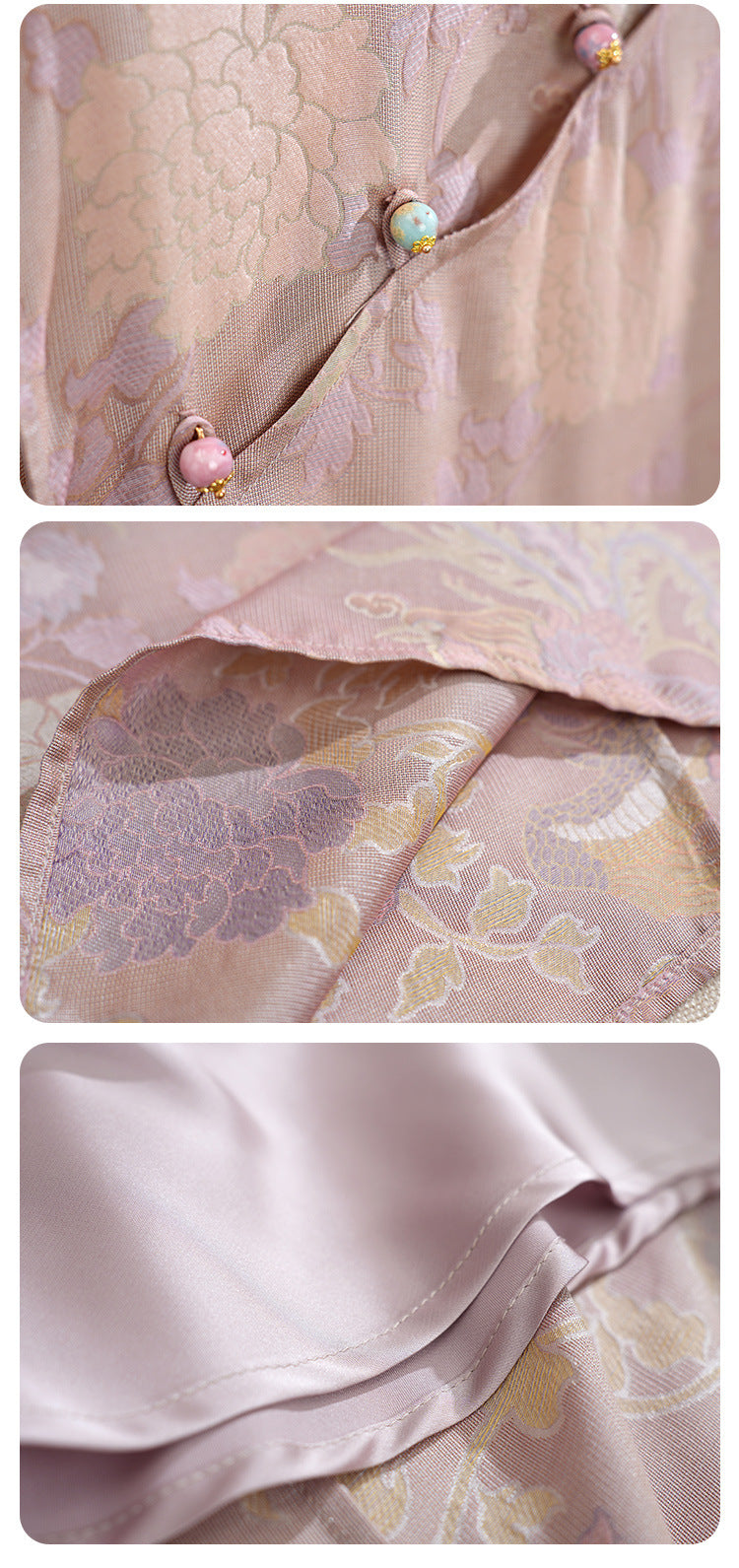 Reimagine traditional elegance with this contemporary silk cheongsam, designed for the modern woman seeking refined cultural aesthetics. Crafted from a luxurious blend of 50% mulberry silk and 50% rayon jacquard, the dress features intricate 3D floral motifs in soft pink hues against an ivory base, inspired by classical Chinese ink paintings. The stand collar with delicate knotted buttons, short sleeves, and high waist create a graceful silhouette, while the hidden back slit adds subtle movement. Paired with a matching pink slip dress (100% polyester lining), this two-piece set offers versatility—wear the outer layer open as a coat or buttoned for a polished look. Perfect for summer weddings, cultural events, or sophisticated evenings.