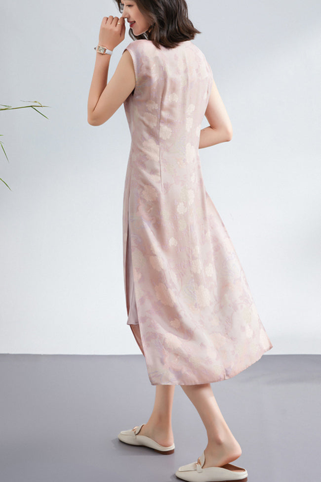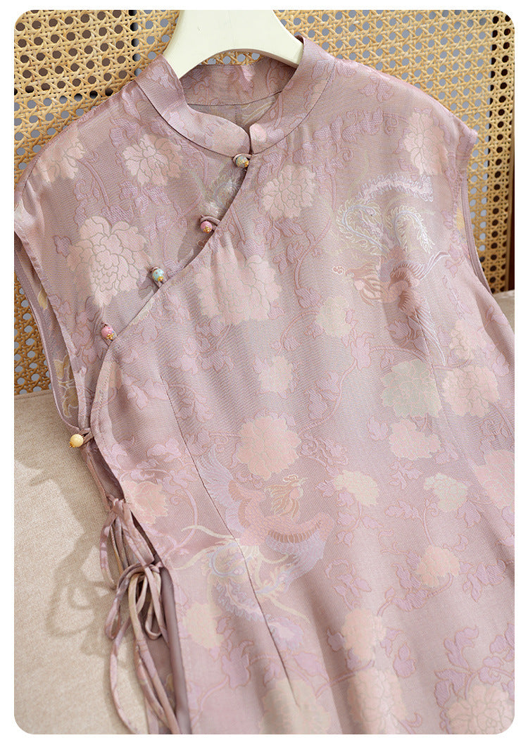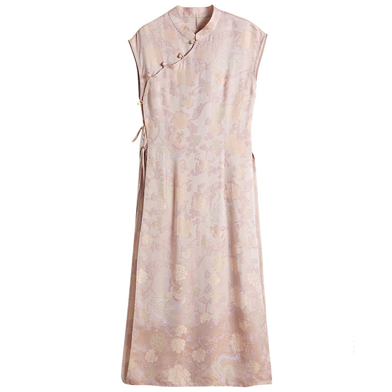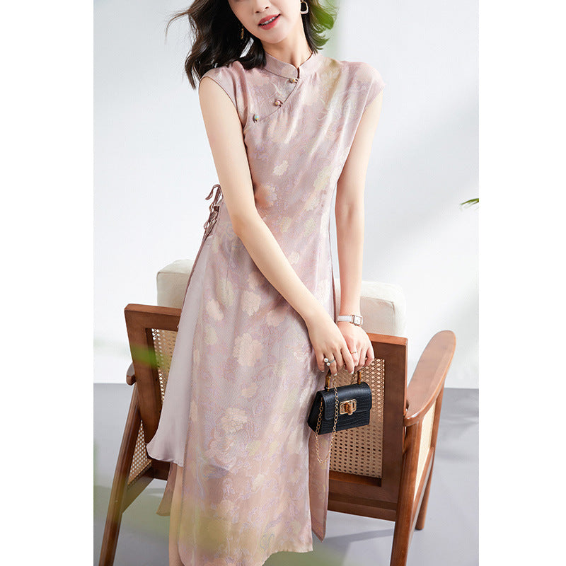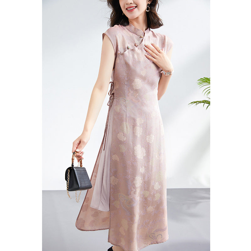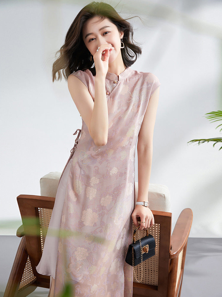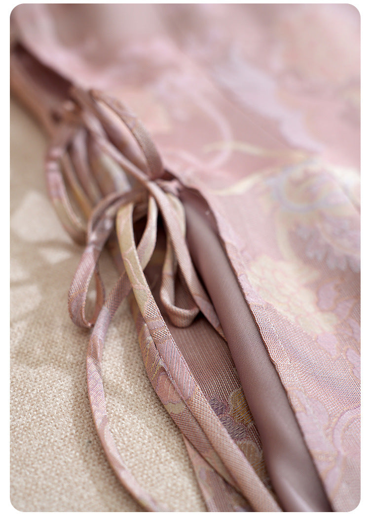 Reimagine traditional elegance with this contemporary silk cheongsam, designed for the modern woman seeking refined cultural aesthetics. Crafted from a luxurious blend of 50% mulberry silk and 50% rayon jacquard, the dress features intricate 3D floral motifs in soft pink hues against an ivory base, inspired by classical Chinese ink paintings. The stand collar with delicate knotted buttons, short sleeves, and high waist create a graceful silhouette, while the hidden back slit adds subtle movement. Paired with a matching pink slip dress (100% polyester lining), this two-piece set offers versatility—wear the outer layer open as a coat or buttoned for a polished look. Perfect for summer weddings, cultural events, or sophisticated evenings.