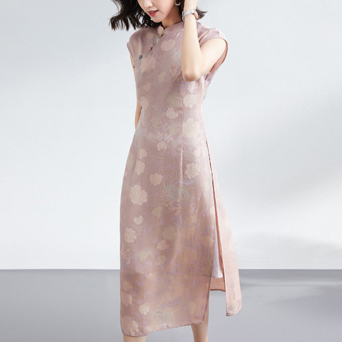 Summer Modern Cheongsam Floral Jacquard Dress with Detachable Slip Short Sleeves