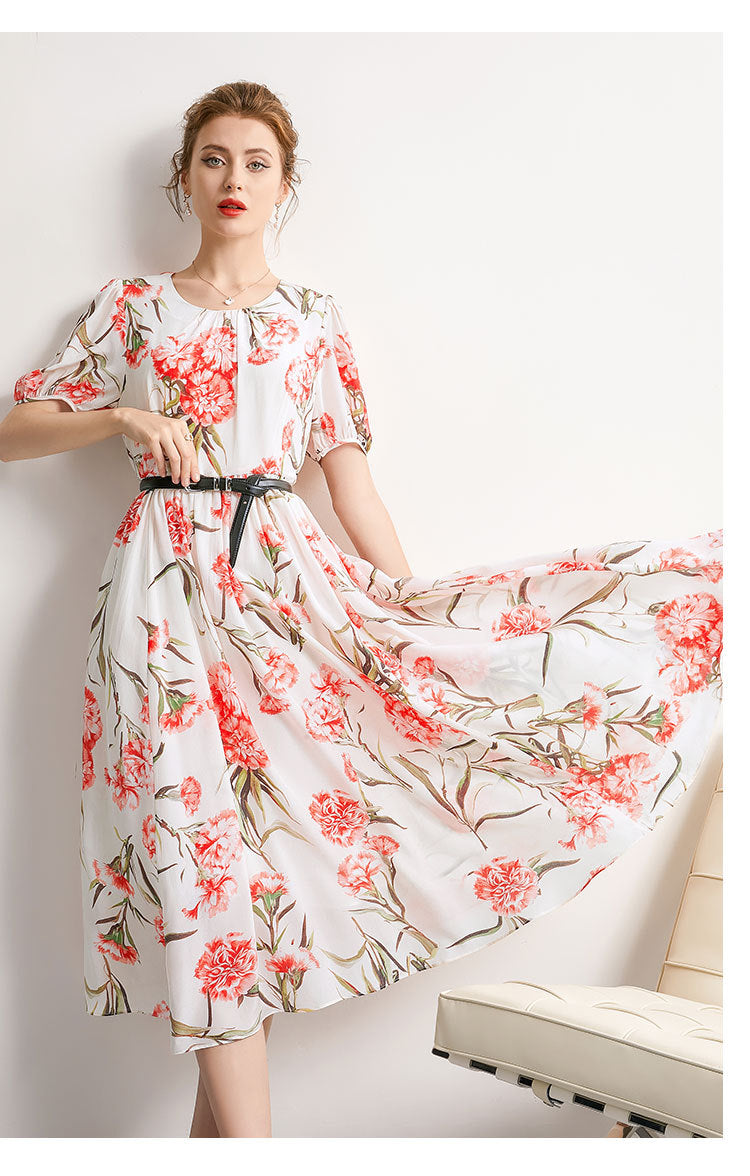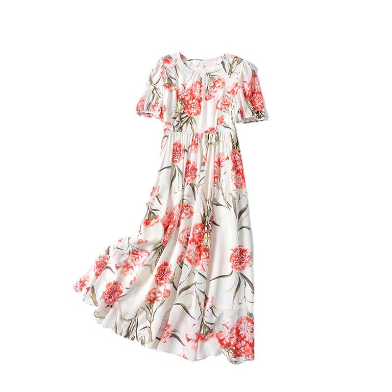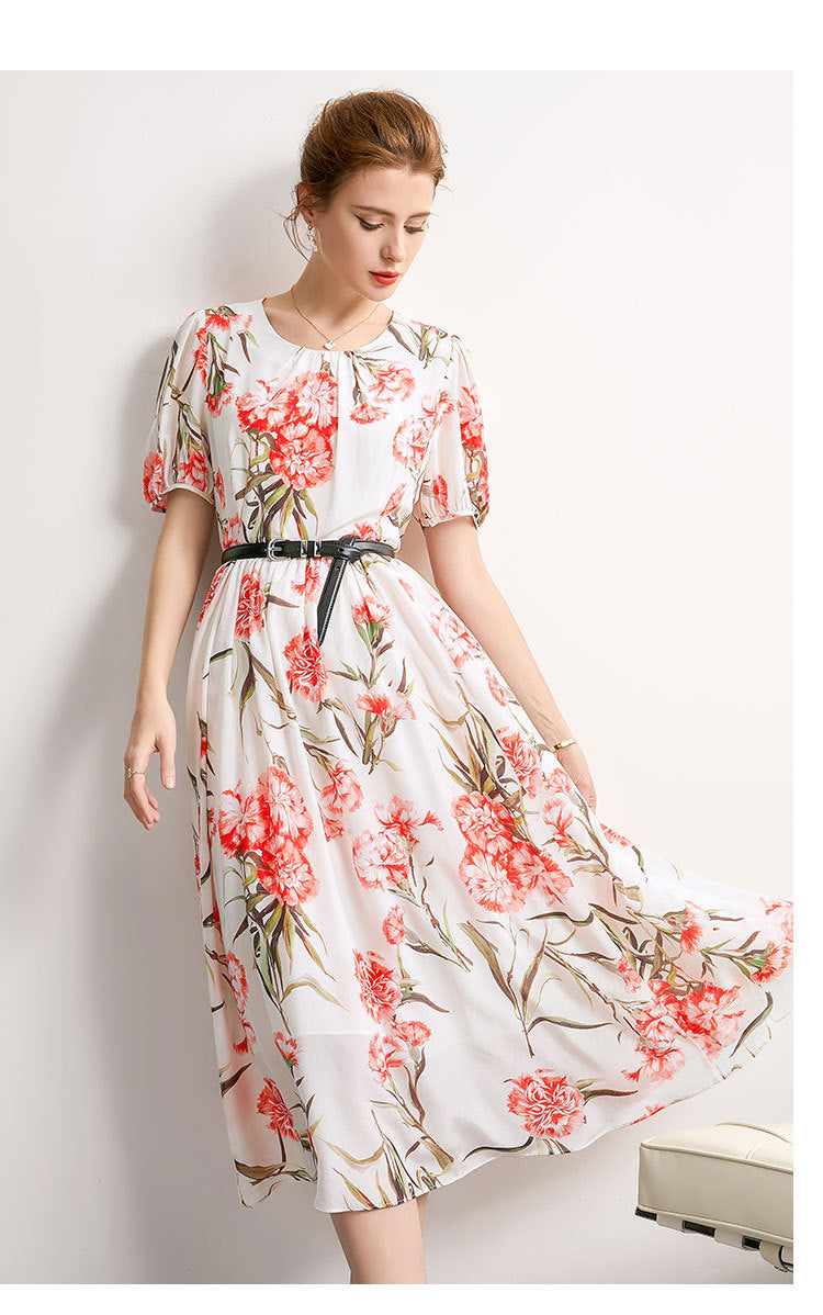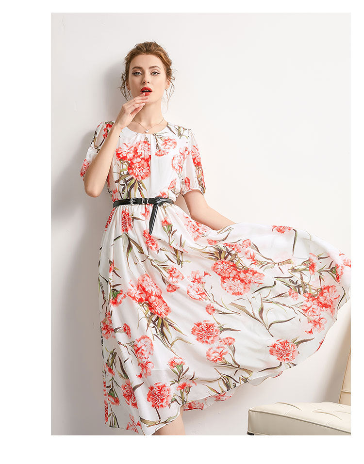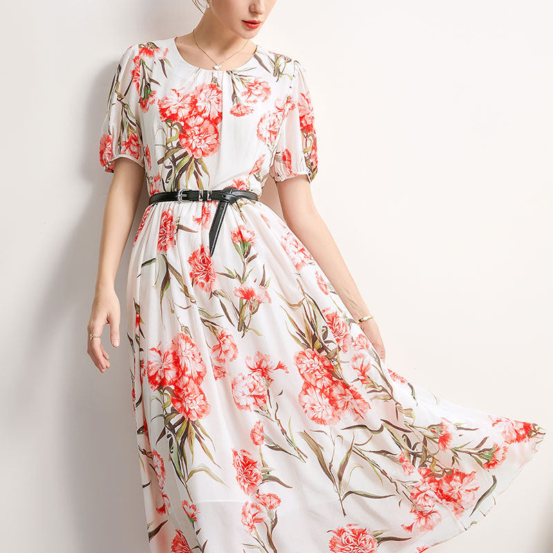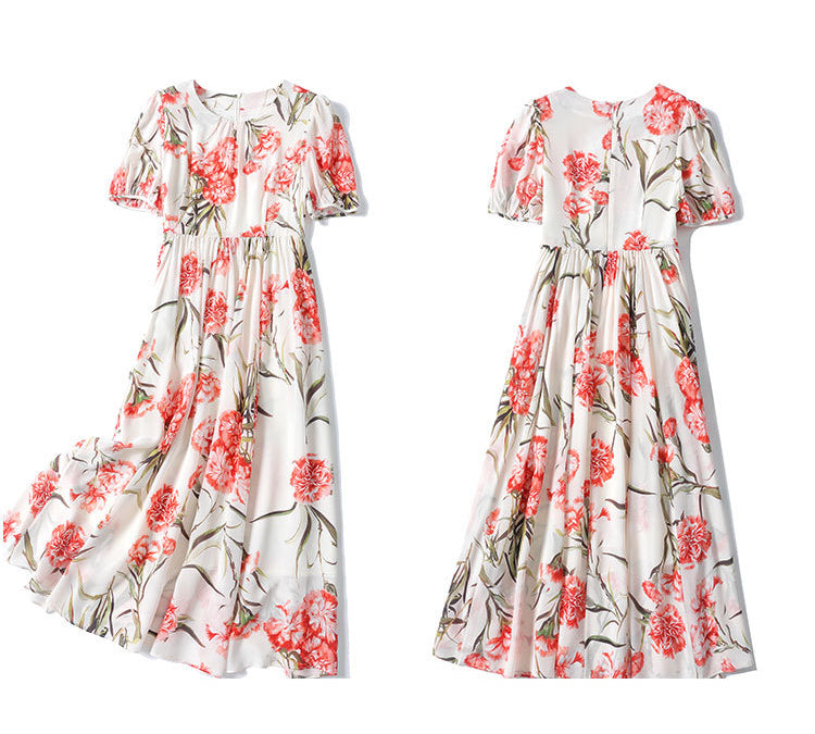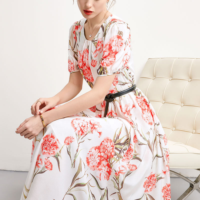 Crafted with the finest mulberry silk, this dress boasts a luxurious and smooth texture, making it a must-have for any fashion-forward individual. The plant flower pattern adds a touch of nature's beauty to this stunning piece.The round neck and short puff sleeves exude a sense of sophistication, while the middle waist design creates a slimming and flattering silhouette. The oversized swing skirt flows gracefully, providing a comfortable and breathable fit for those warm summer days.