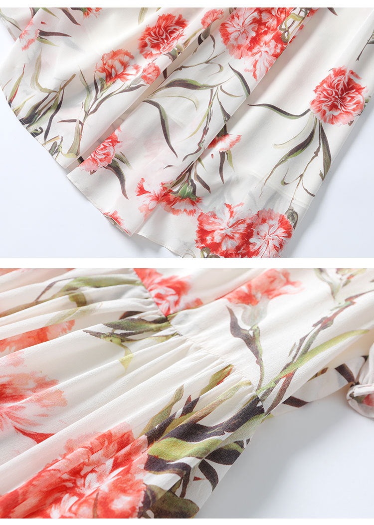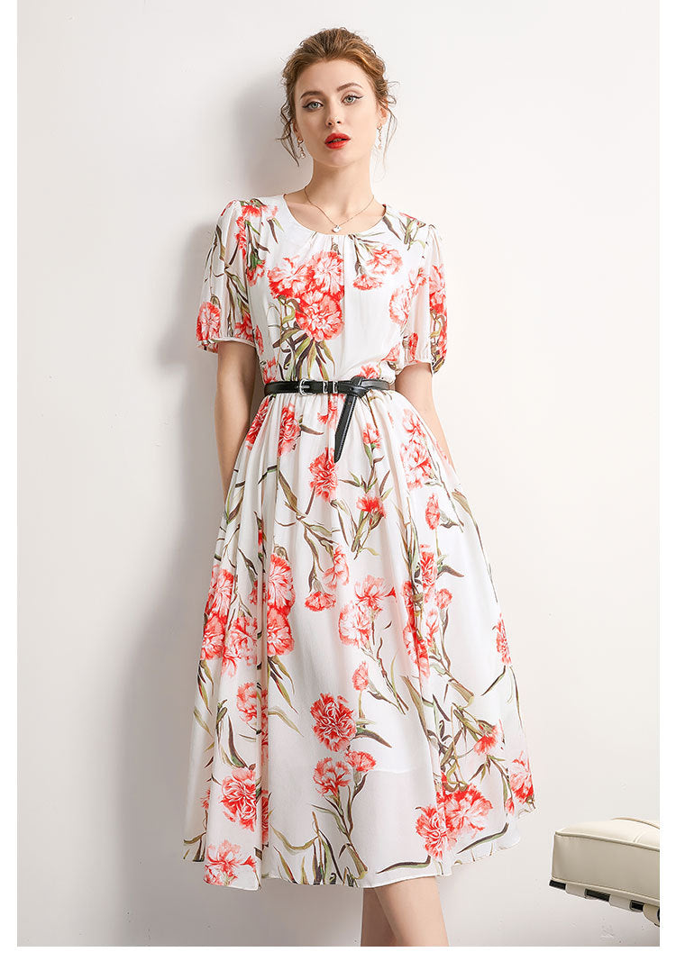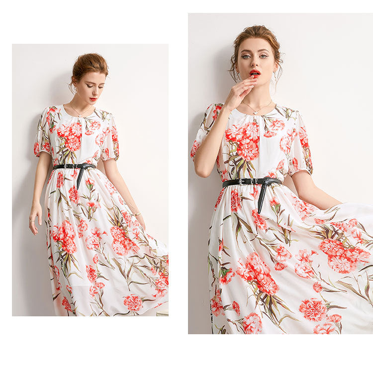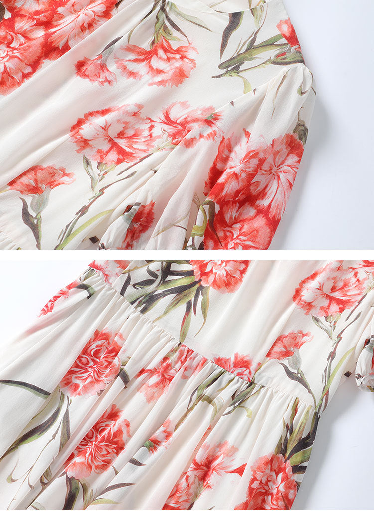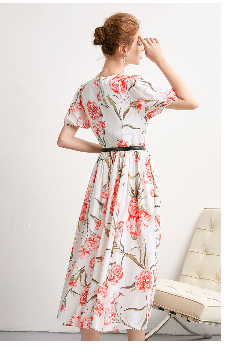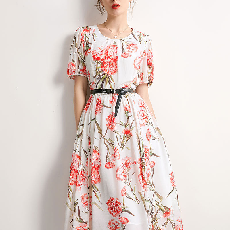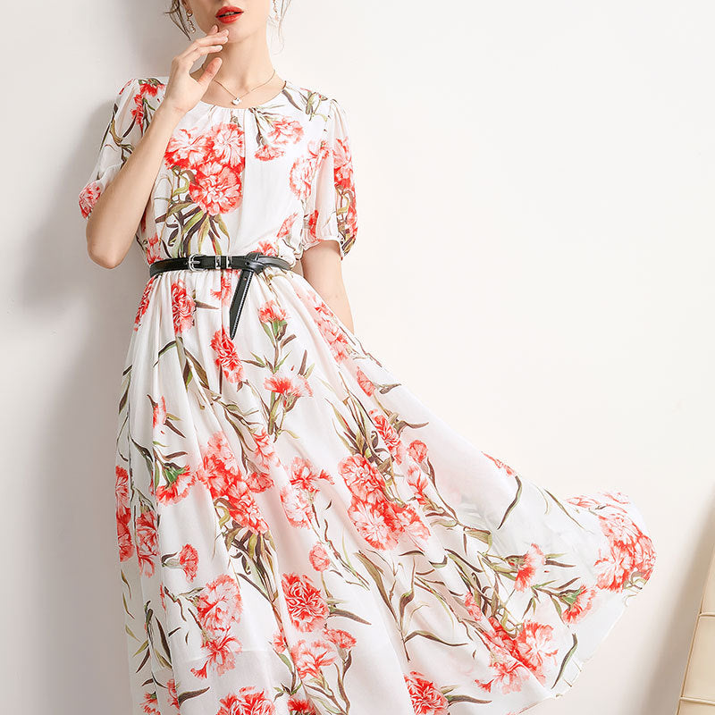 Crafted with the finest mulberry silk, this dress boasts a luxurious and smooth texture, making it a must-have for any fashion-forward individual. The plant flower pattern adds a touch of nature's beauty to this stunning piece.The round neck and short puff sleeves exude a sense of sophistication, while the middle waist design creates a slimming and flattering silhouette. The oversized swing skirt flows gracefully, providing a comfortable and breathable fit for those warm summer days.