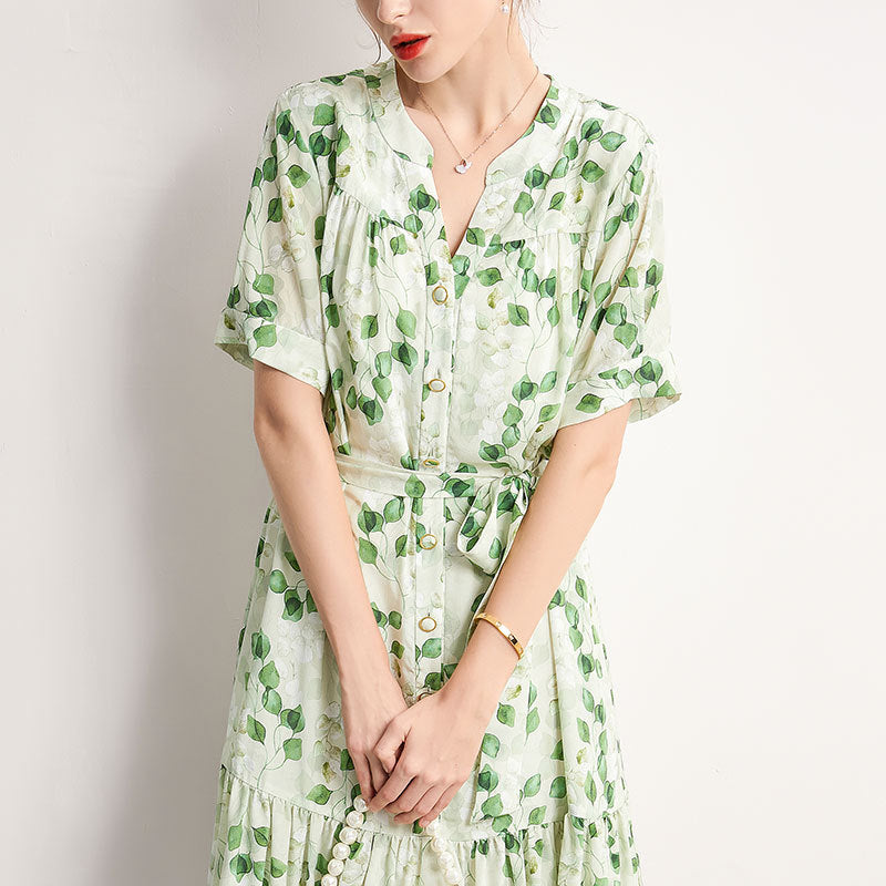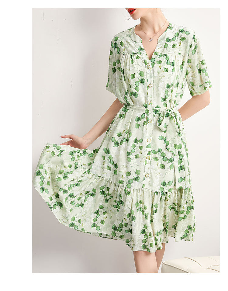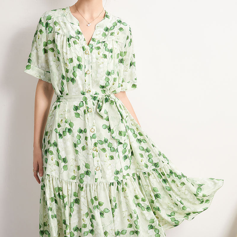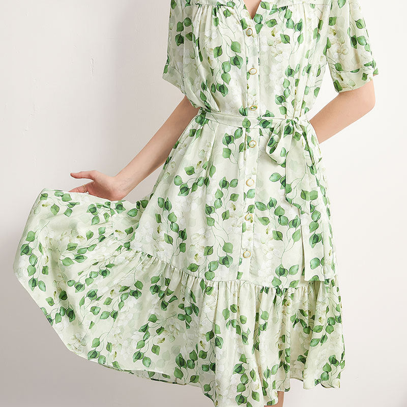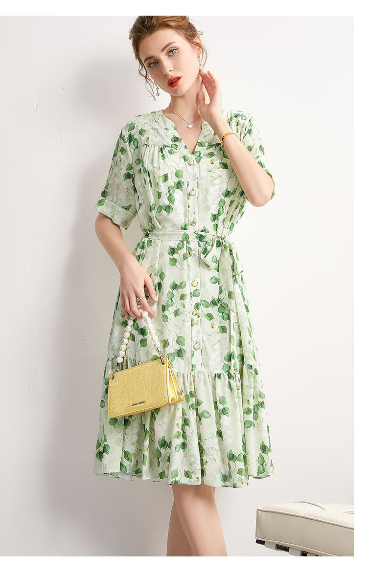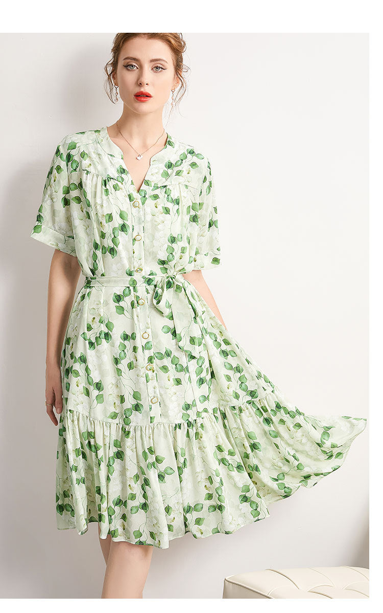 Make a statement with the trendy buttons element, adding a fashionable touch to the cardigan-style dress. The conventional short sleeves and single-breasted, multi-button placket ensure both style and convenience, allowing you to step into summer with flair and confidence.