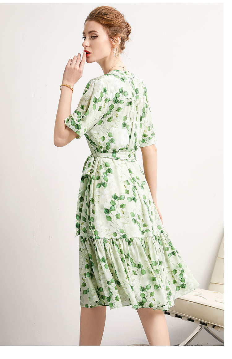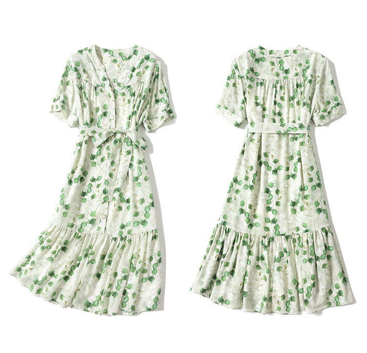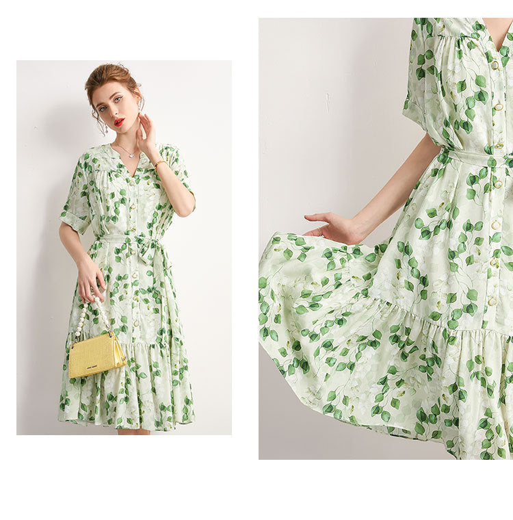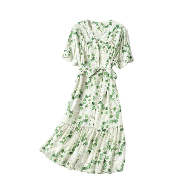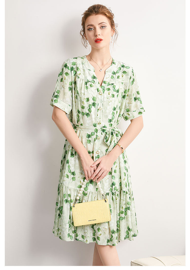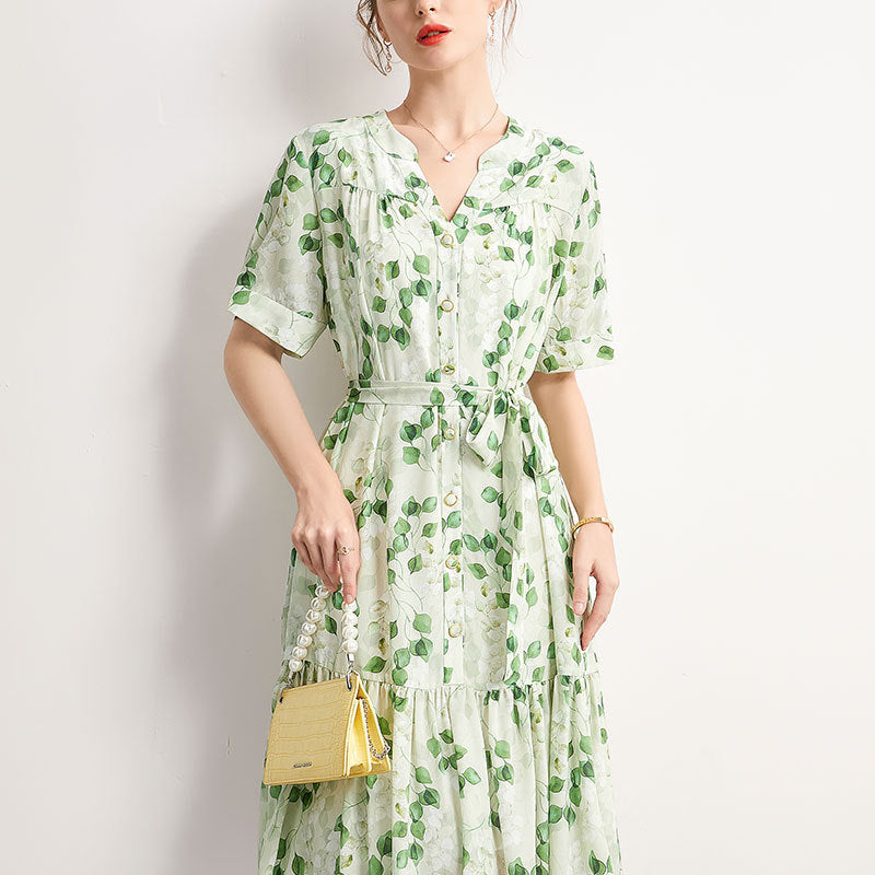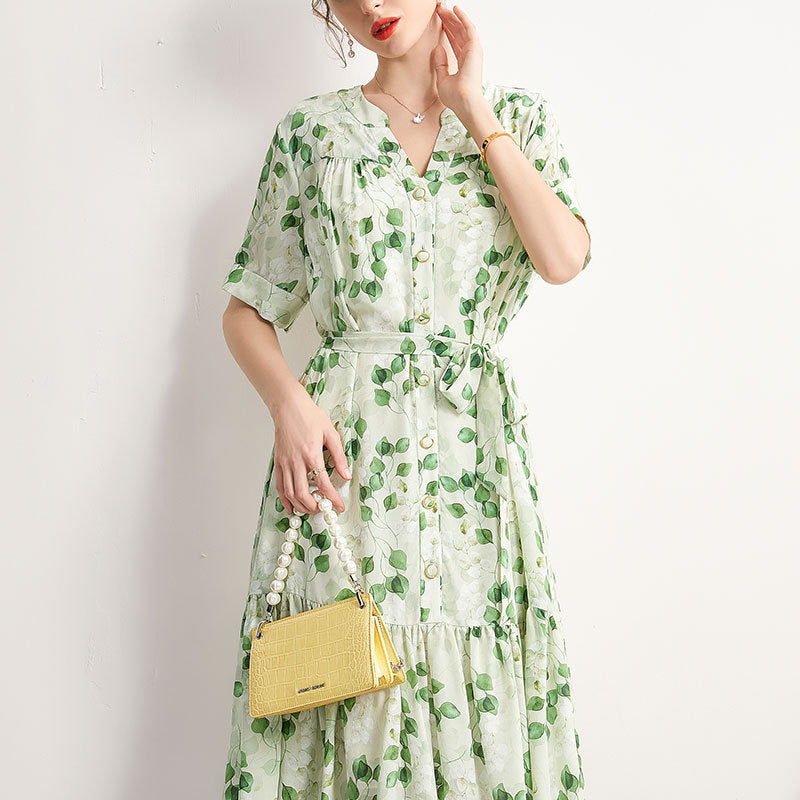 Make a statement with the trendy buttons element, adding a fashionable touch to the cardigan-style dress. The conventional short sleeves and single-breasted, multi-button placket ensure both style and convenience, allowing you to step into summer with flair and confidence.
