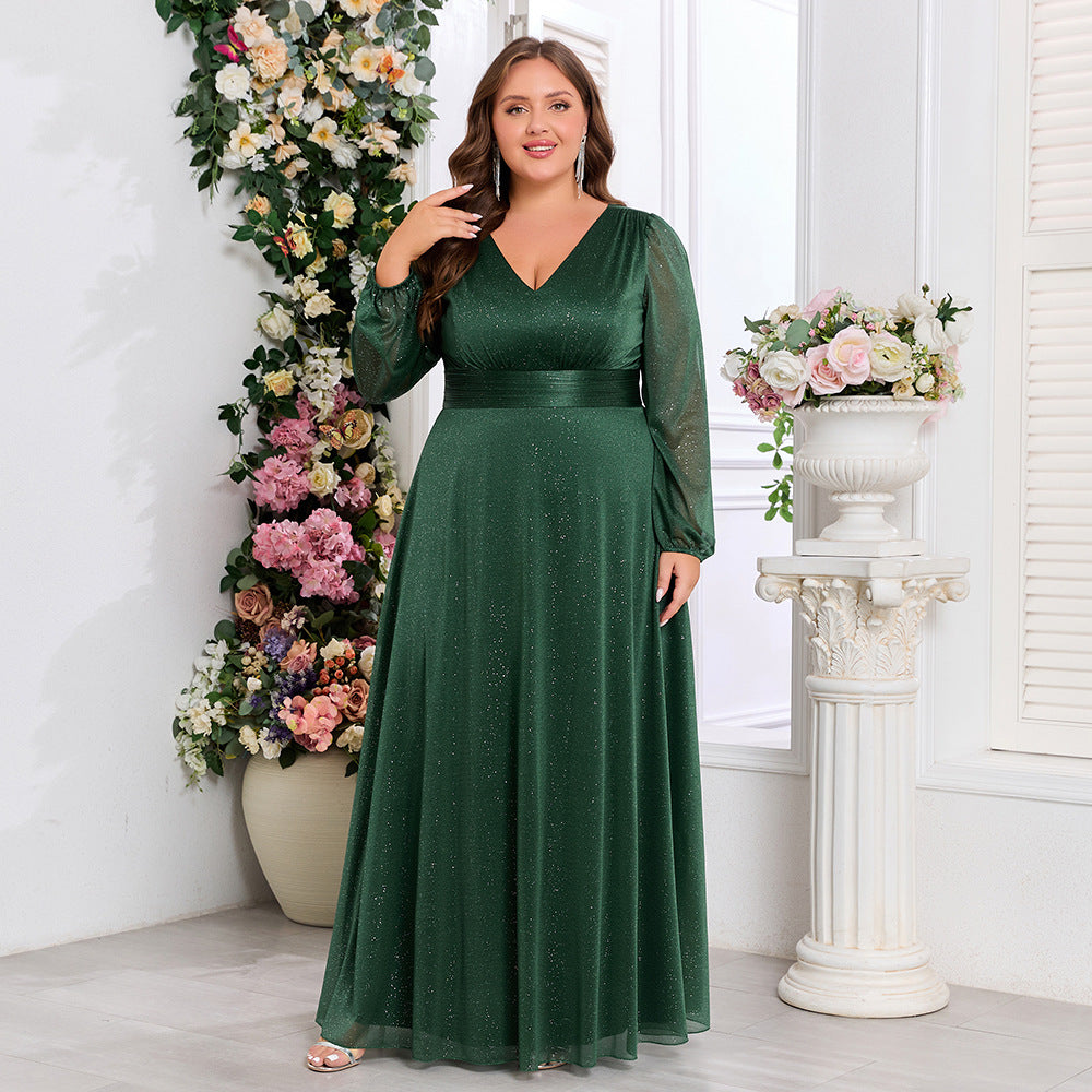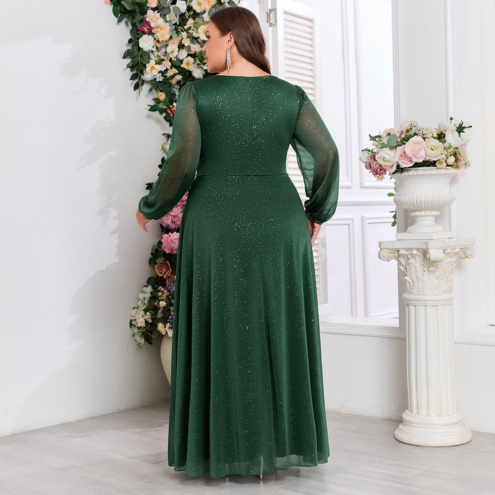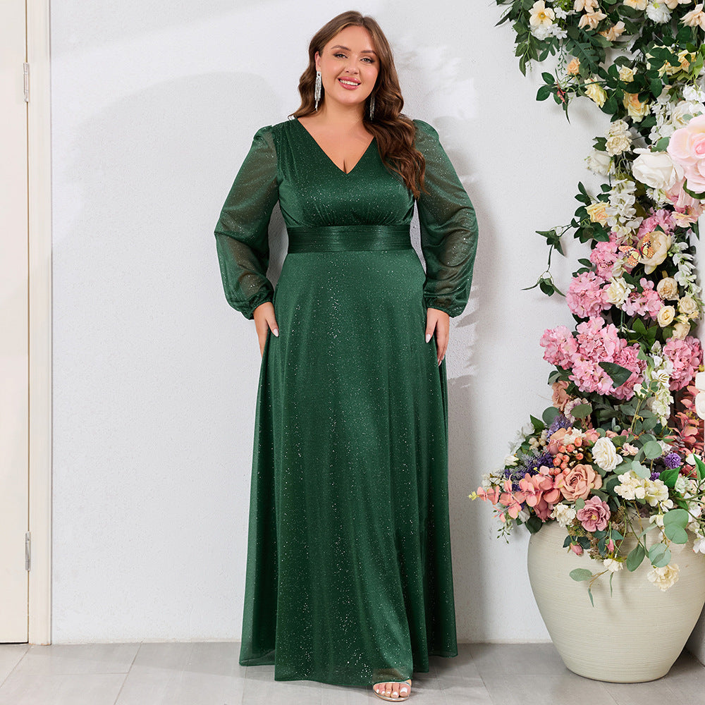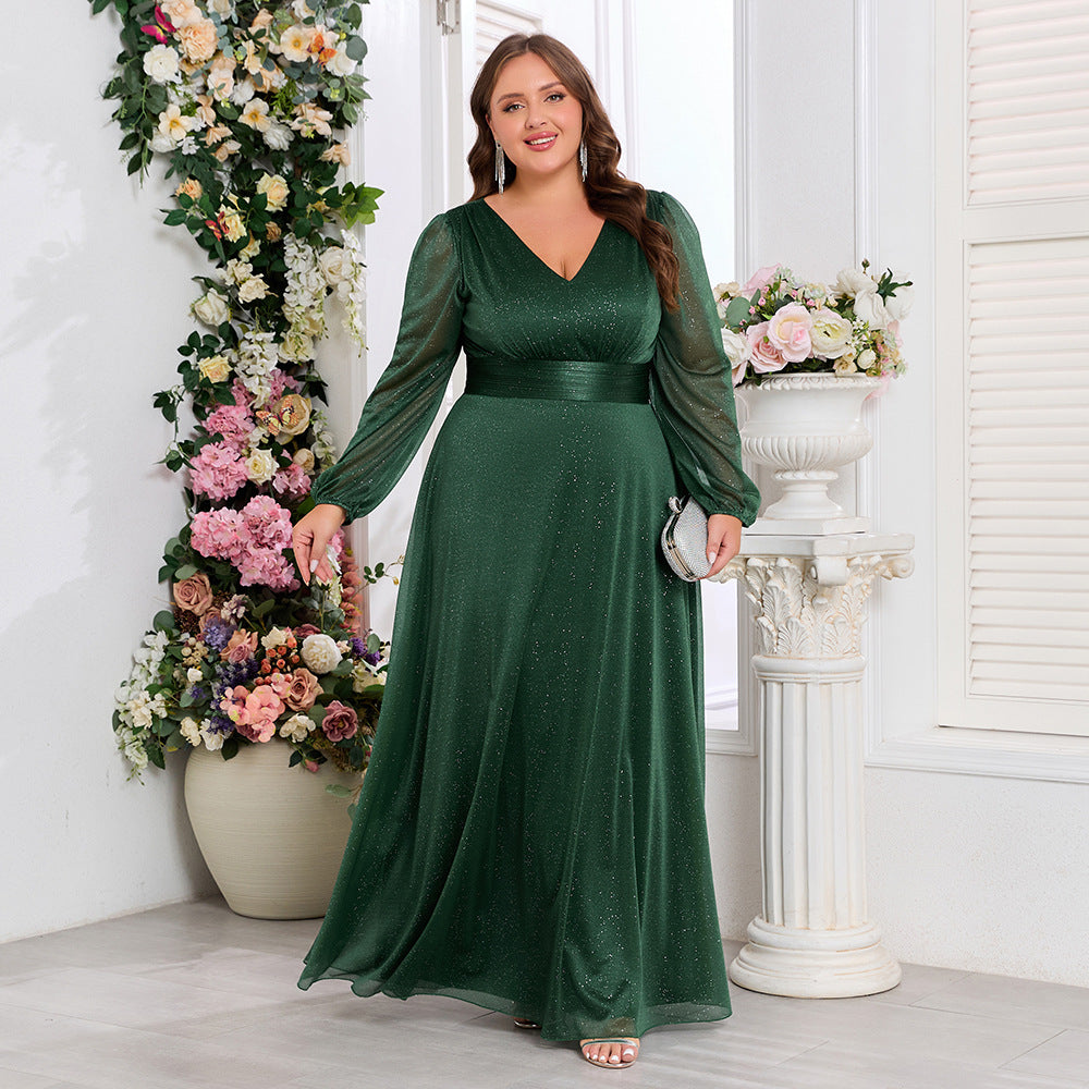 Elevate your elegance with this V - neck shimmering chiffon gown, designed for formal events and weddings. Featuring sheer long sleeves and a high - waisted A - line silhouette, the dress combines sophistication with comfort. The glittery finish adds a touch of glamour, while the full lining ensures breathability. Available in forest green and versatile sizing (S - 4XL), it’s perfect for parties, galas, or runway showcases.