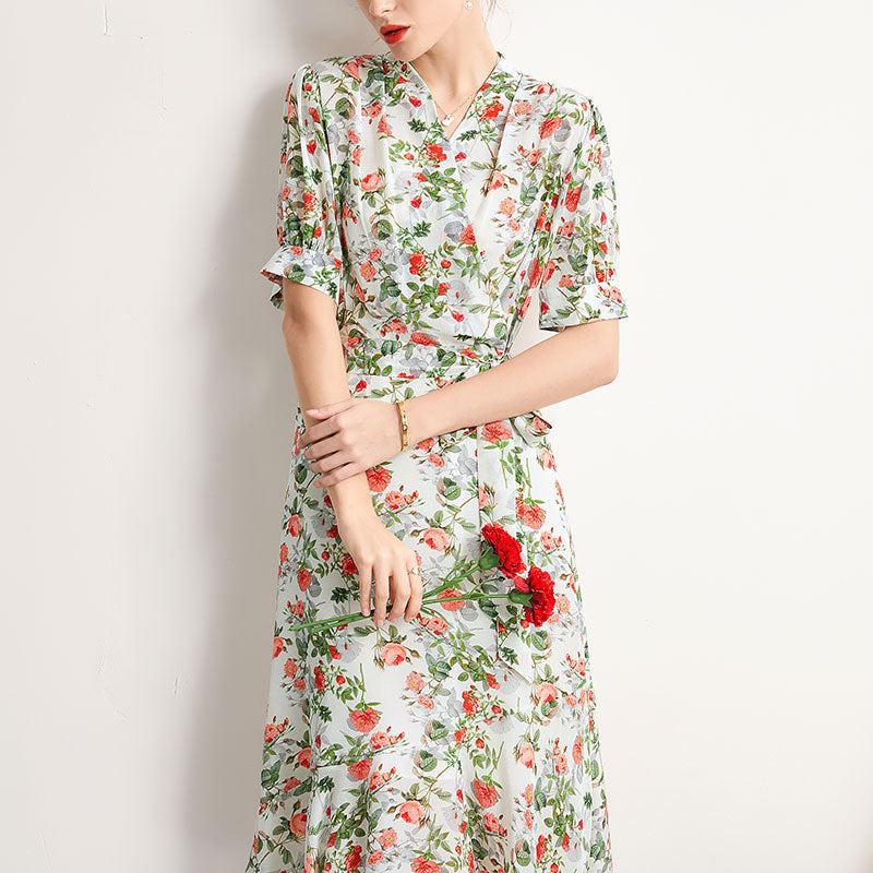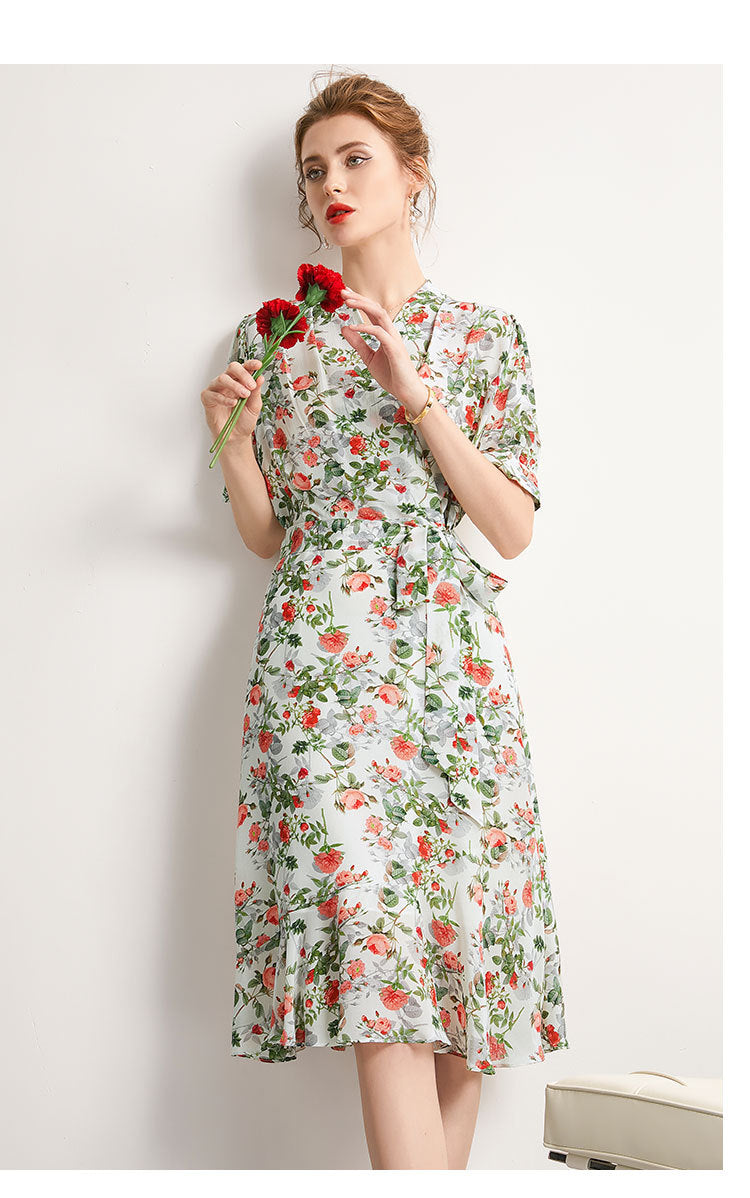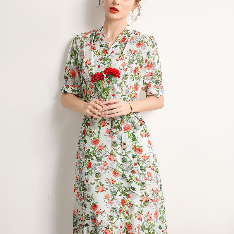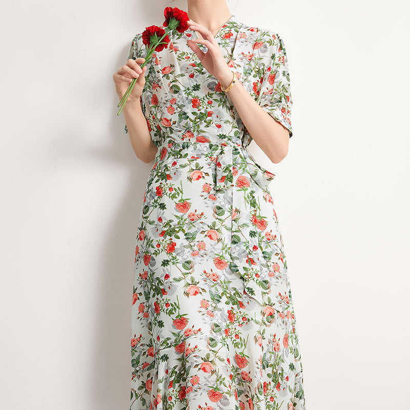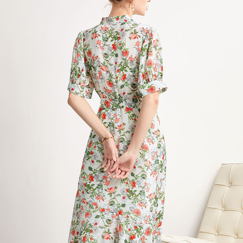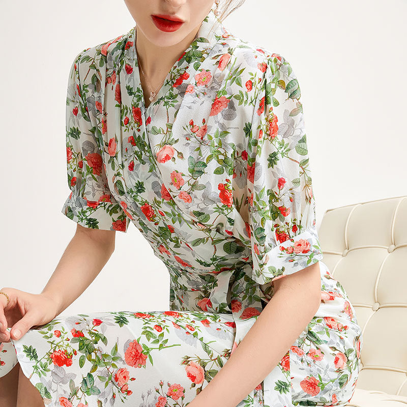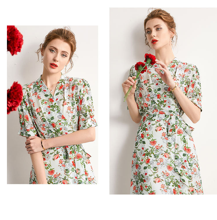 Women's Summer Silk Dress French Style Slim Printed Dress