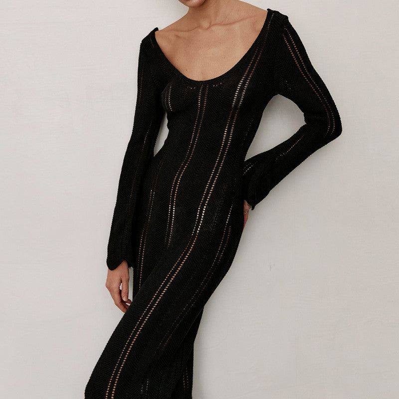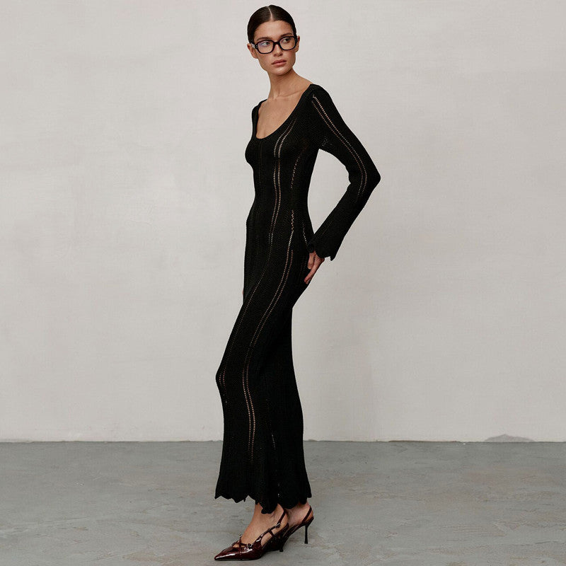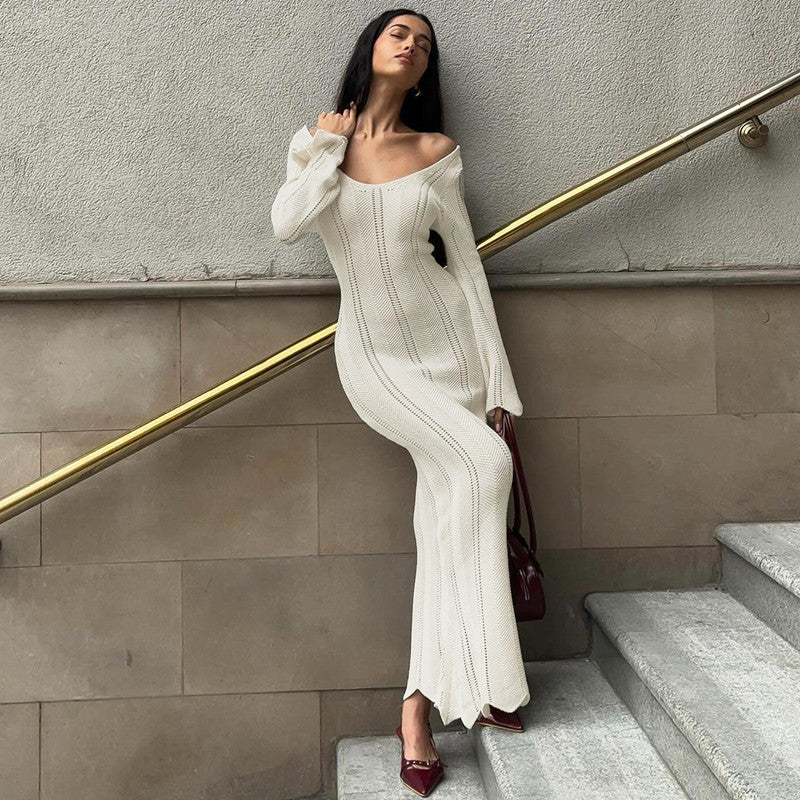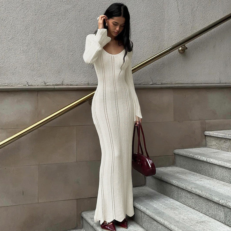 2025 Ribbed Knit Bodycon Dress with U-Neck and Long Sleeves